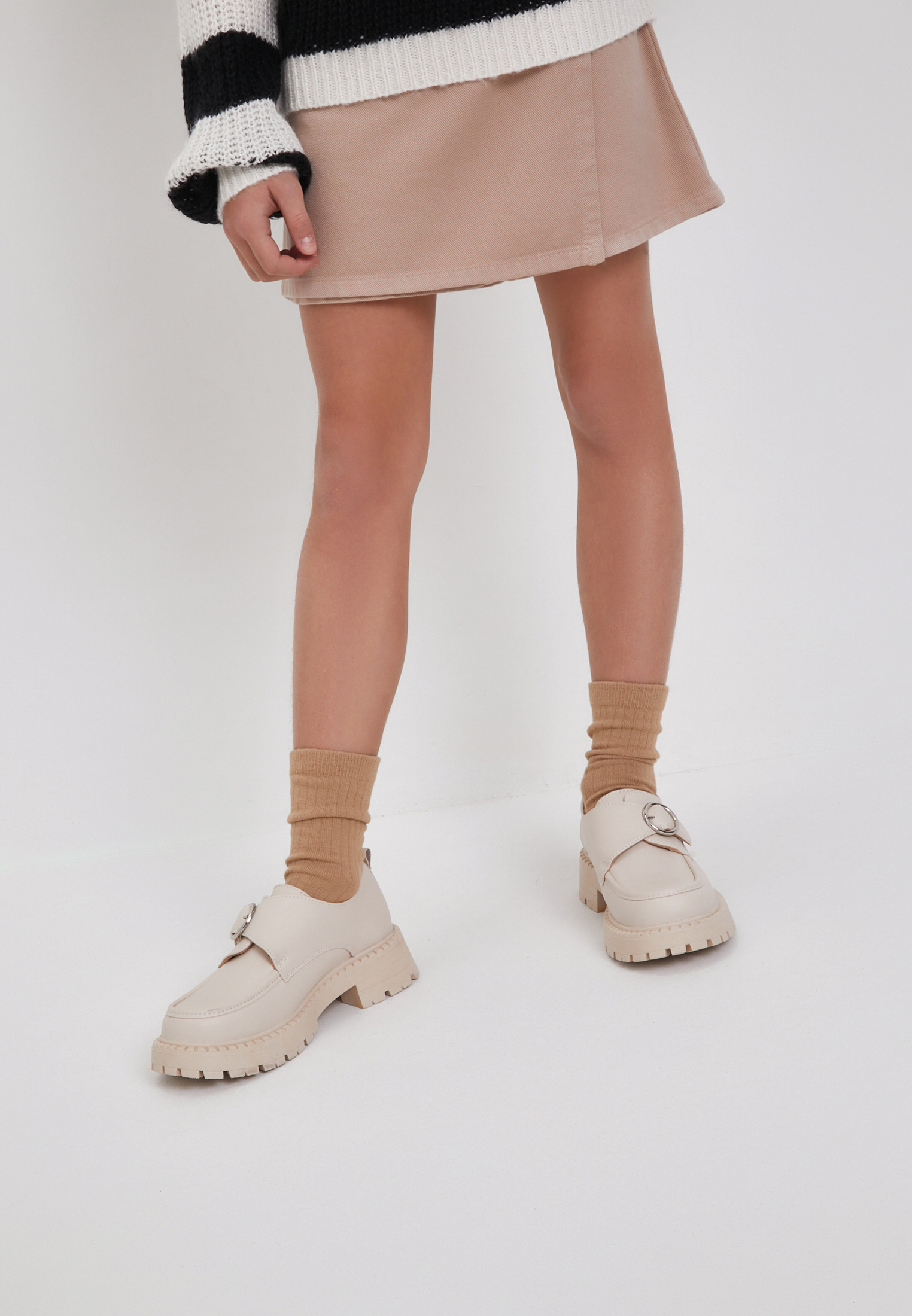 - Для создания взрослого стильного образа достаточно одной пары детских монки молочного нежного оттенка. Верх пары выполнен в коже из спилка с акцентной пряжкой, а подклад - из качественной кожи шевро. Объемная подошва высотой 4 см из резины добавляет изделию гибкости и улучшает амортизацию.