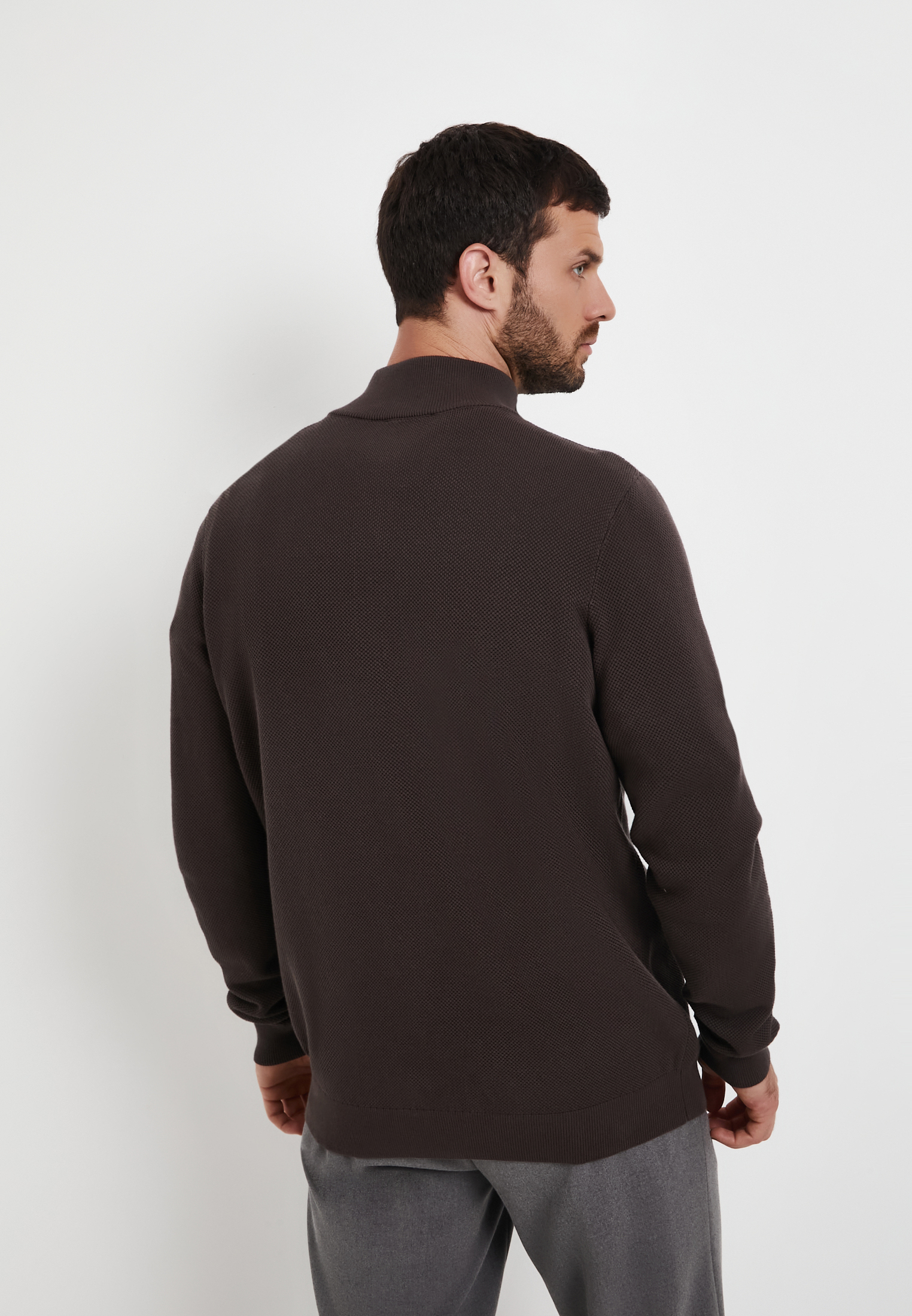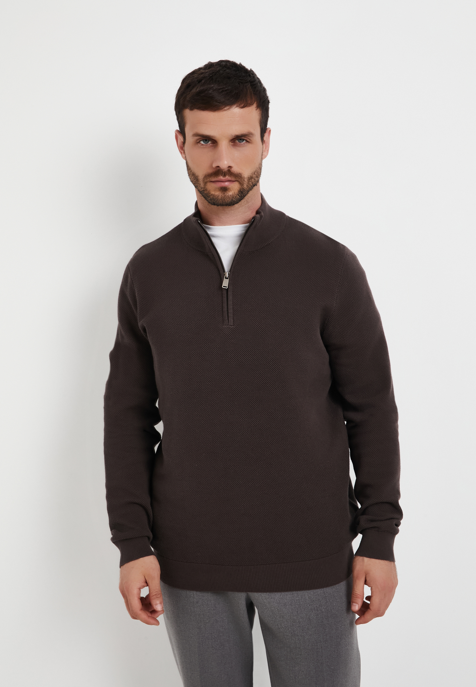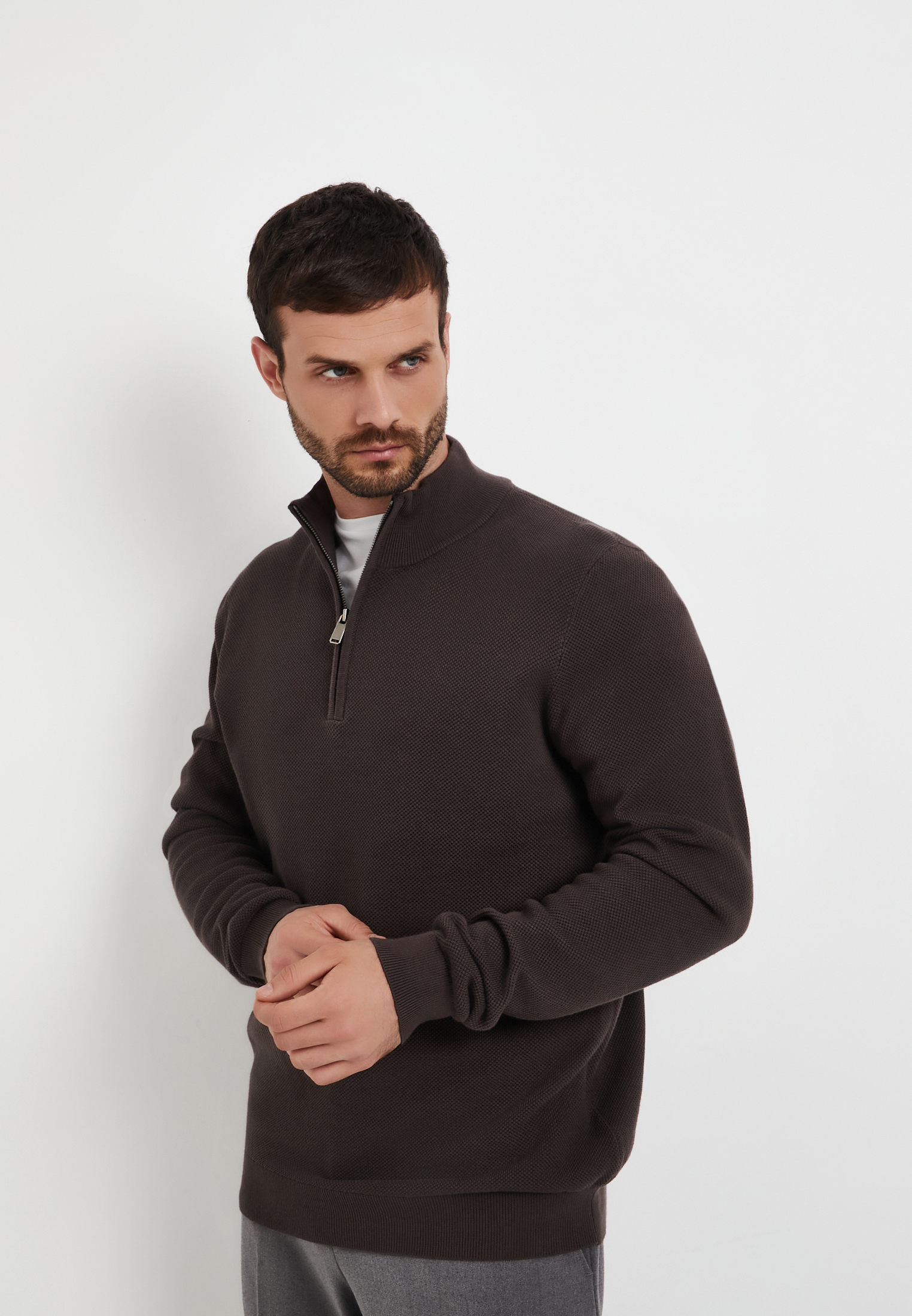 - Мужской джемпер Mascotte серого цвета –универсальный элемент гардероба. Модель отличается оригинальной рельефной вязкой «пике» (особый способ переплетения нитей, который создает ткань с характерной текстурой в виде мелких, приподнятых ромбов или ячеек), что добавляет фактурности изделию. Воротник-стойка и молния по центру груди позволяют регулировать степень защиты от ветра и создавать различные варианты стилизации. Полуприлегающий крой обеспечивает свободу движений и подчеркивает фигуру. Изготовлен из натурального хлопка (100%), обеспечивающего максимальный комфорт и воздухопроницаемость. Этот теплый свитер идеально подойдет как для создания многослойного образа под верхнюю одежду, так и для повседневного стиля в прохладное время года. На модели размер L. Параметры модели: 98-78-97, рост 186