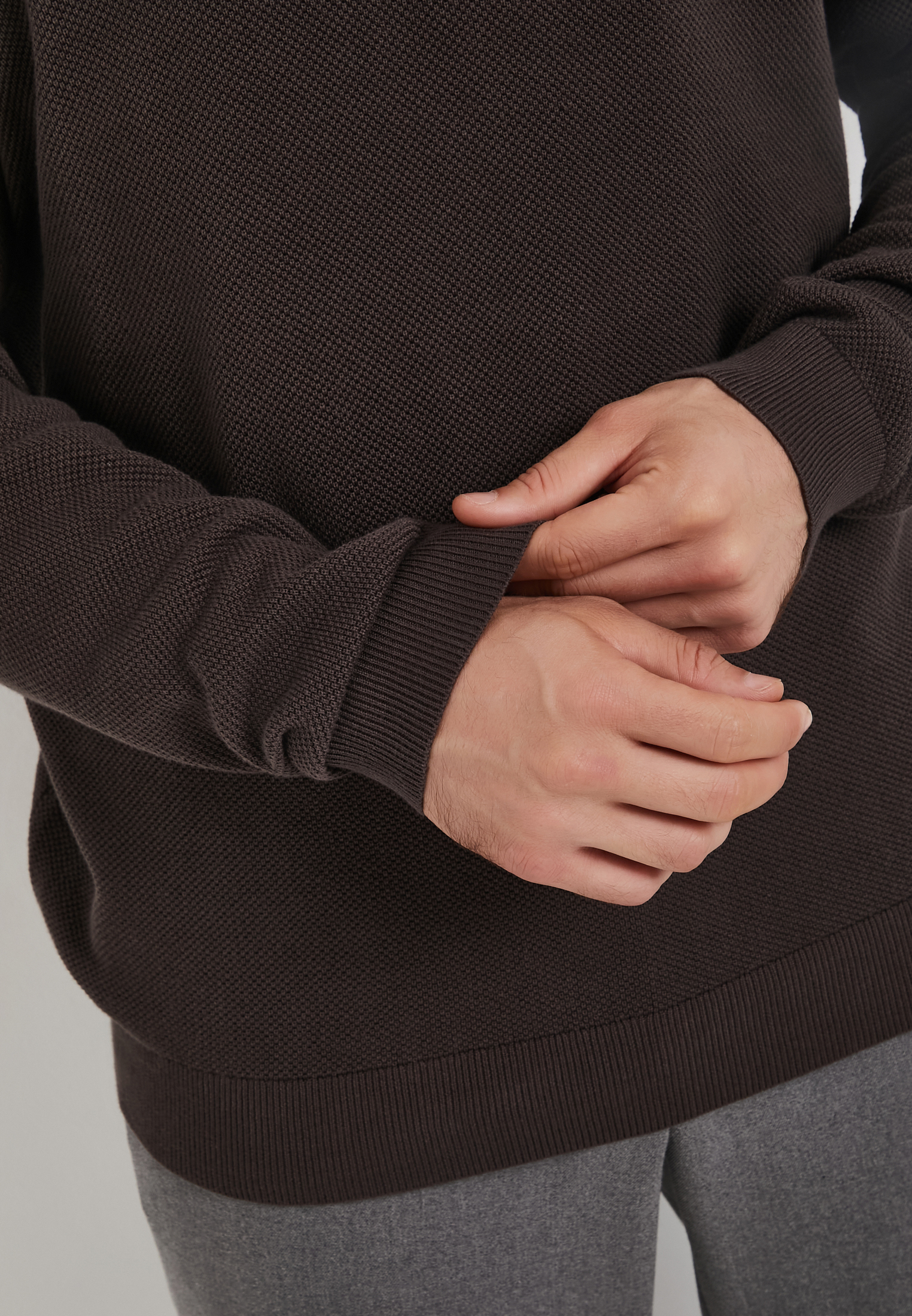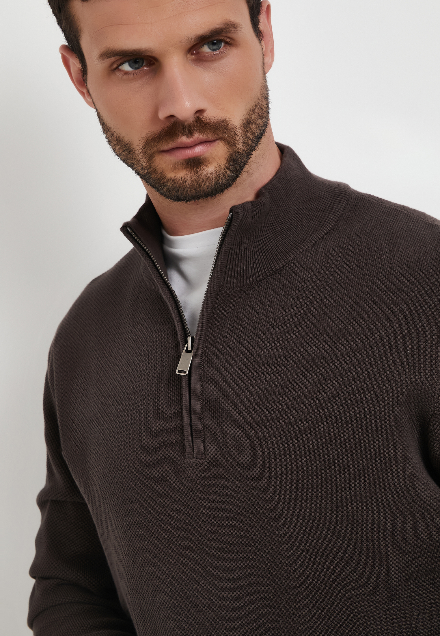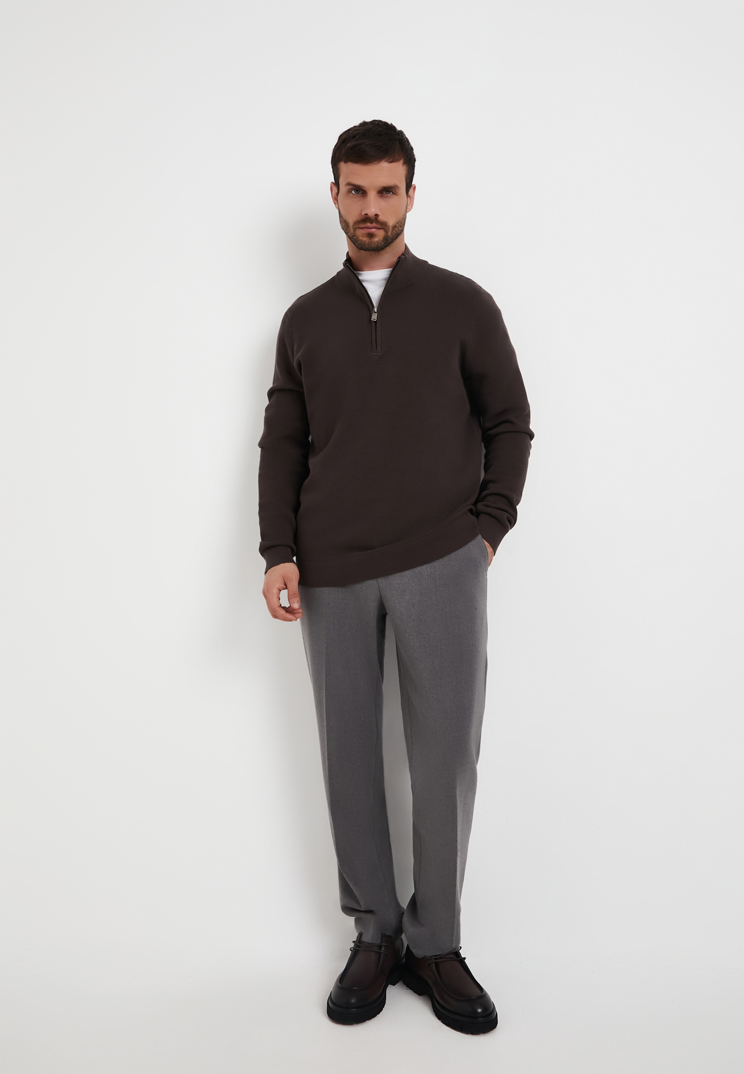 - Мужской джемпер Mascotte серого цвета –универсальный элемент гардероба. Модель отличается оригинальной рельефной вязкой «пике» (особый способ переплетения нитей, который создает ткань с характерной текстурой в виде мелких, приподнятых ромбов или ячеек), что добавляет фактурности изделию. Воротник-стойка и молния по центру груди позволяют регулировать степень защиты от ветра и создавать различные варианты стилизации. Полуприлегающий крой обеспечивает свободу движений и подчеркивает фигуру. Изготовлен из натурального хлопка (100%), обеспечивающего максимальный комфорт и воздухопроницаемость. Этот теплый свитер идеально подойдет как для создания многослойного образа под верхнюю одежду, так и для повседневного стиля в прохладное время года. На модели размер L. Параметры модели: 98-78-97, рост 186