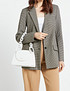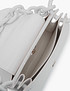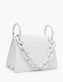 - Стильная и компактная сумка топ-хэндл из искусственной кожи. Притягательная элегантность в сочетании с трендовой массивной ручкой-цепочкой в тон создают несколько эклектичный, но в тоже время гармоничный образ аксессуара. Размеры: длина 21 см, ширина 10 см, высота без учета ручки 14 см. Длина ремня составляет 107 см. Для удобства хранения мелочей внутри предусмотрено 2 кармана: накладной открытый и прорезной на молнии. Модель представлена в черном, белом и лавандовом цветах на выбор.