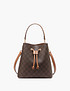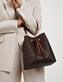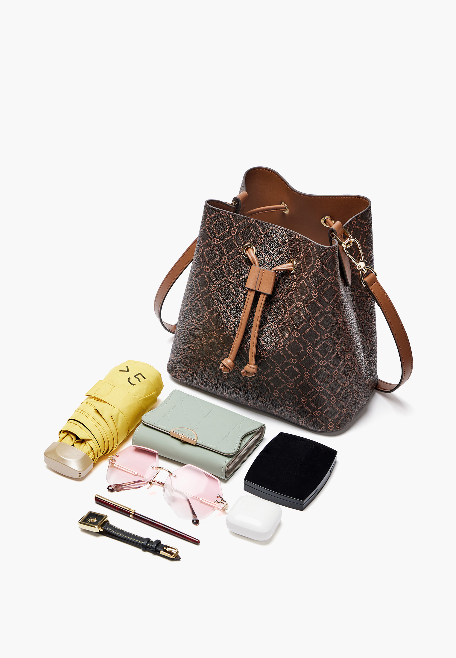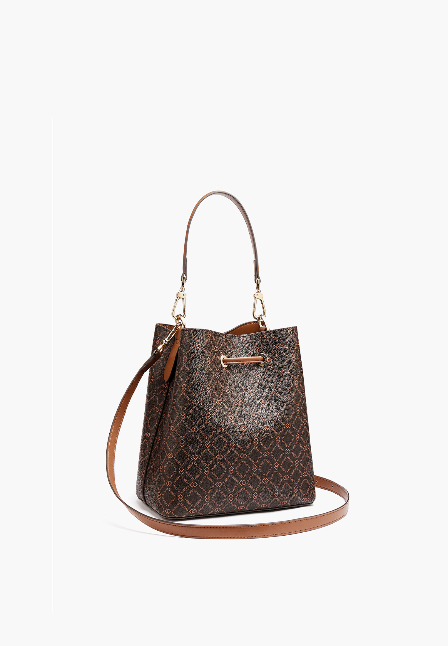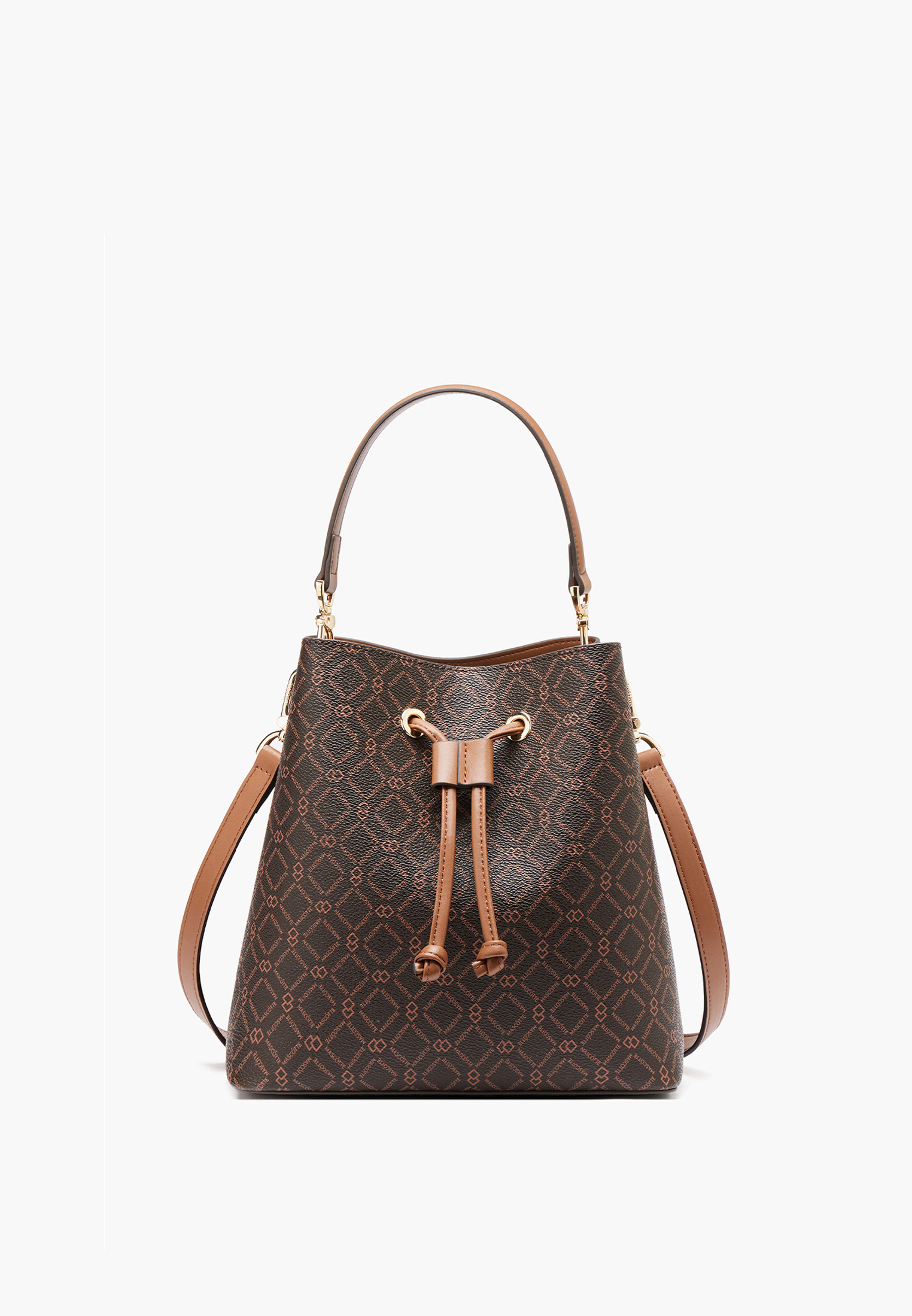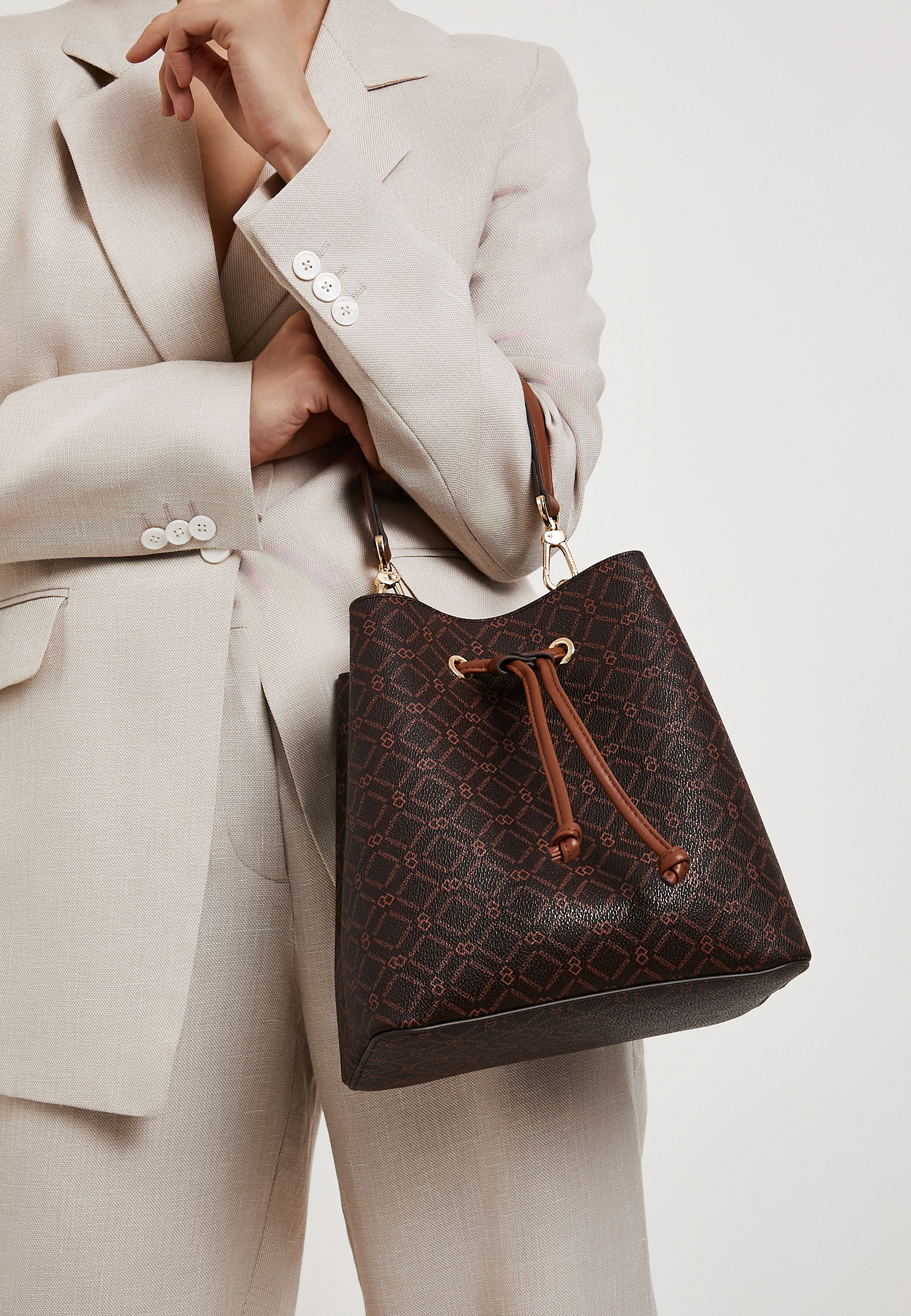 - Эта стильная женская сумка в коричневом цвете станет универсальным дополнением гардероба. Выполнена из прочной эко-кожи с фирменным геометрическим принтом Mascotte, который придает аксессуару оригинальность и современный характер. Верхняя часть сумки затягивается завязками с металлическими люверсами, обеспечивая удобство и надежность хранения. Внутри предусмотрено практичное отделение на молнии для важных мелочей. Сумка комплектуется двумя съемными ремешками: коротким для ношения в руке и длинным регулируемым плечевым ремнем длиной 136 см. Компактные размеры 23×23×14 см делают модель удобной для ежедневного использования, а теплый коричневый оттенок легко сочетается с любыми образами. Модель также доступна в молочном цвете.
