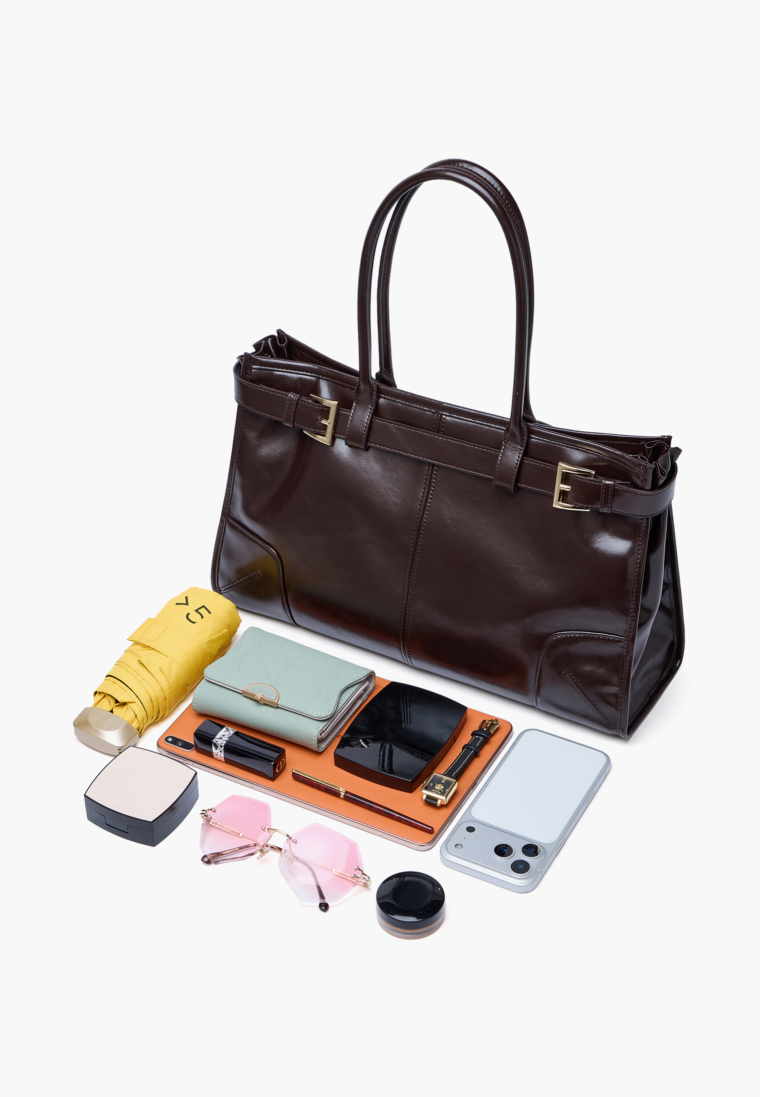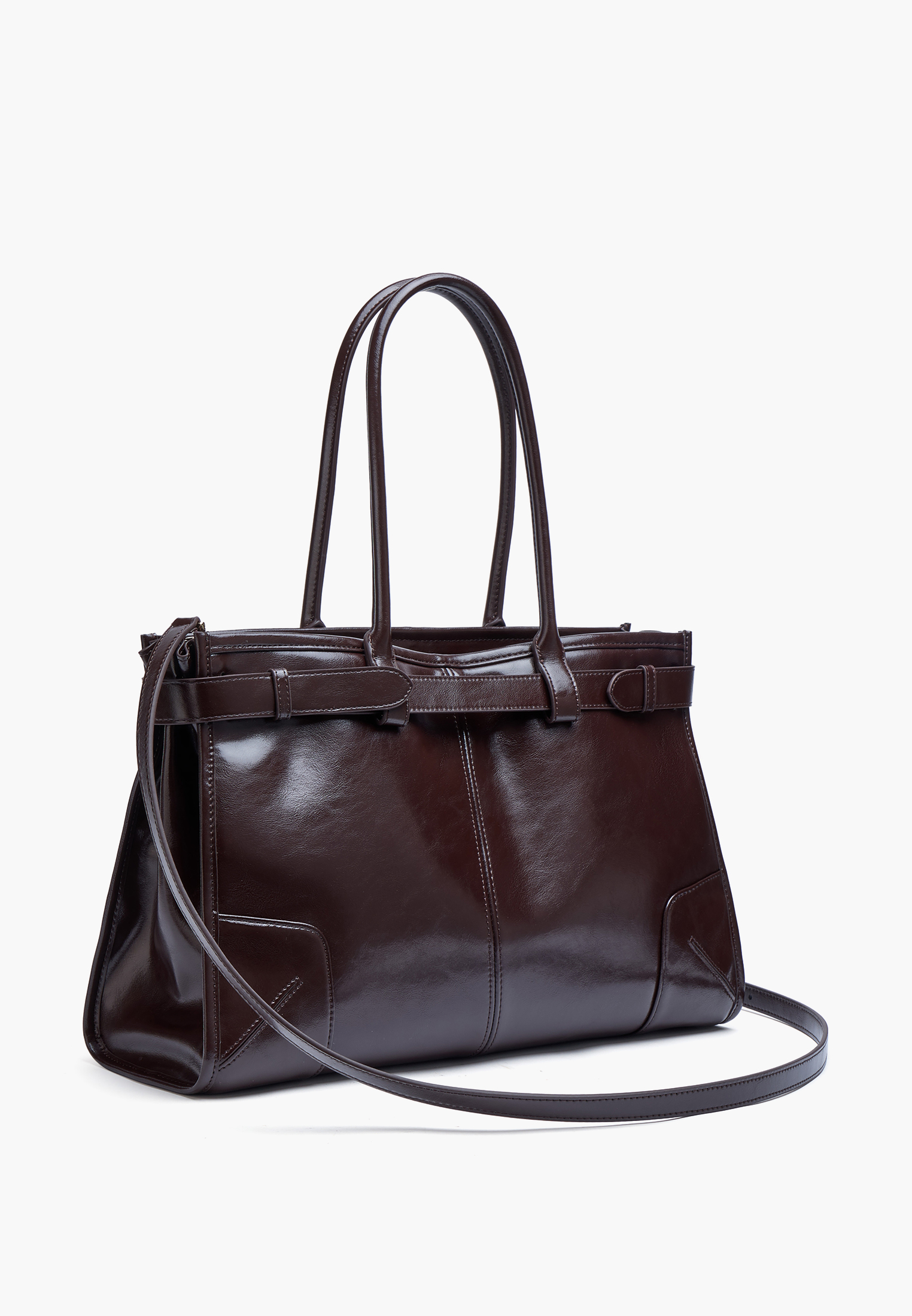 - Коричневая женская сумка-тоут из натуральной кожи станет универсальным и функциональным дополнением повседневного образа. Глубокий коричневый оттенок выглядит благородно и легко сочетается с базовым гардеробом, добавляя образу элегантности. Вместительное основное отделение застегивается на молнию, помогая надежно хранить личные вещи. Внутри расположен карман на молнии для мелочей, светло-золотистая фурнитура аккуратно дополняет дизайн, а декоративный ремешок на шлевках с двумя пряжками служит стильной деталью. Удобные ручки подходят для ношения в руках, а съемный регулируемый ремень длиной 120 см позволяет комфортно носить сумку на плече. Размеры 24×42×11,5 см (высота с ручками 44 см) обеспечивают хорошую вместительность - модель подходит для документов формата А4. Вес 750 г делает сумку легкой и удобной для ежедневного использования. Модель также доступна в молочном цвете.