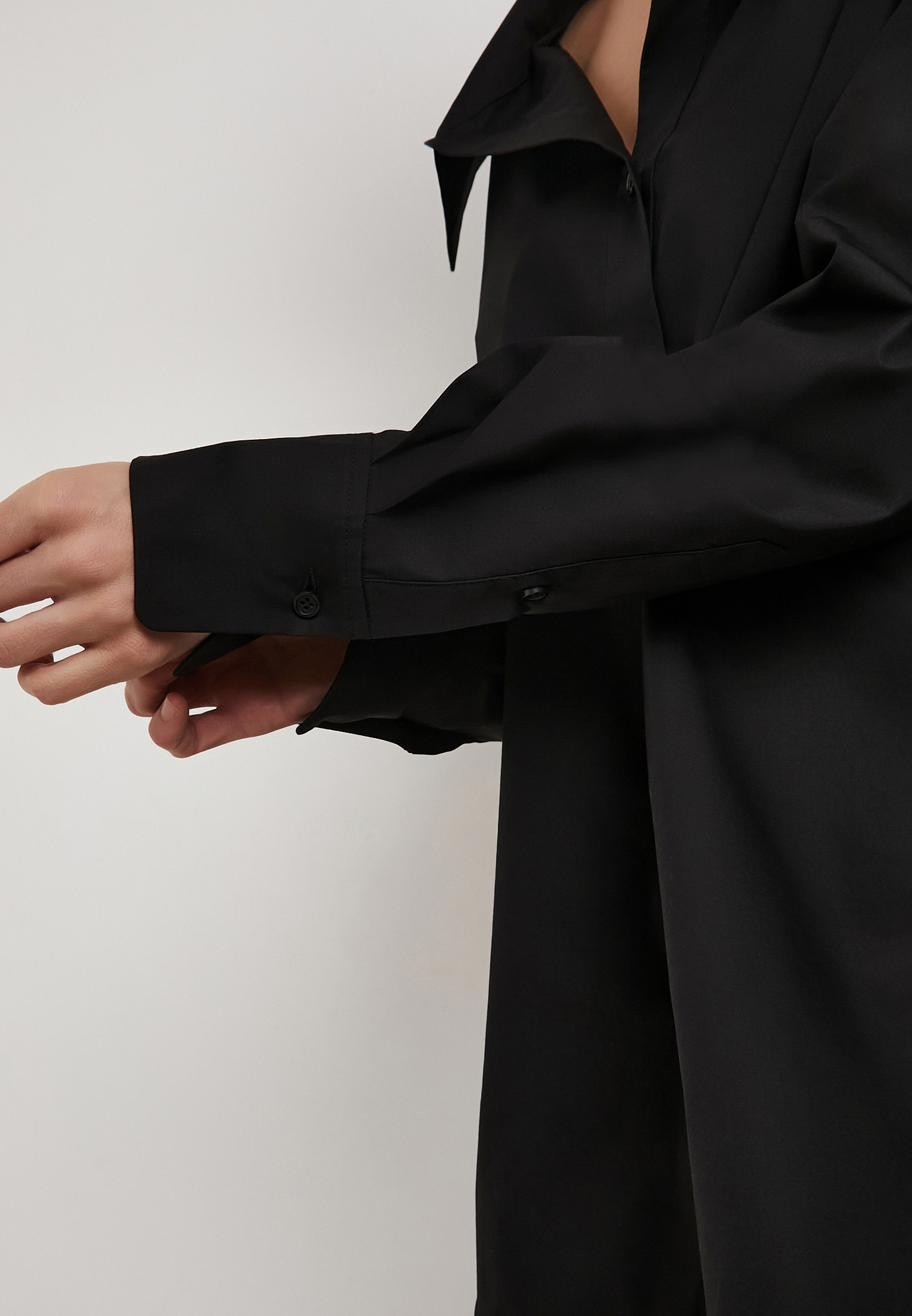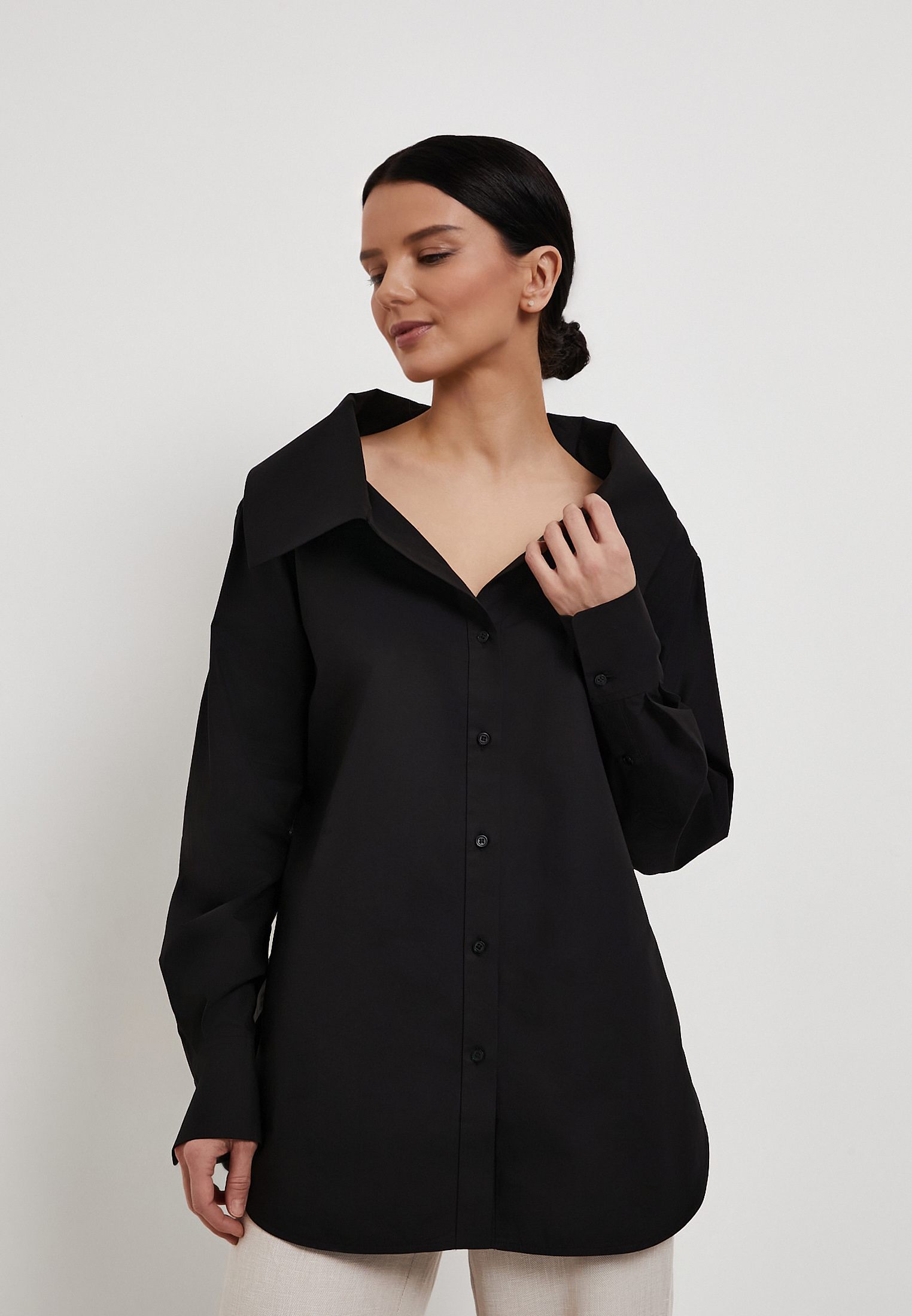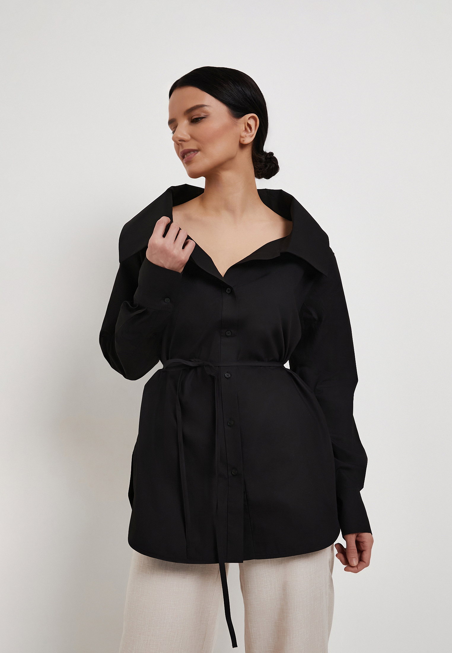 - Черная рубашка Mascotte из 100% натурального хлопка станет стильной основой для офисных и повседневных образов. Легкий дышащий материал гипоаллергенен и обеспечивает комфорт в течение всего дня. Модель выделяется выразительным отложным воротником с расширенным вырезом горловины, который добавляет образу женственности и утонченности. Удлиненный свободный силуэт визуально стройнит, а пояс-завязки из основной ткани позволяют подчеркнуть талию и создать аккуратные пропорции. Высокие манжеты служат дополнительным акцентом и придают дизайну характер. Рекомендуется ручная стирка до 30 °C с деликатным отжимом, вертикальная сушка в тени и глажка при температуре до 110 °C, отбеливание запрещено, допустима щадящая химчистка. На модели размер S, параметры: 83-60-92, рост 172 см. Рубашка также доступна в белом цвете.