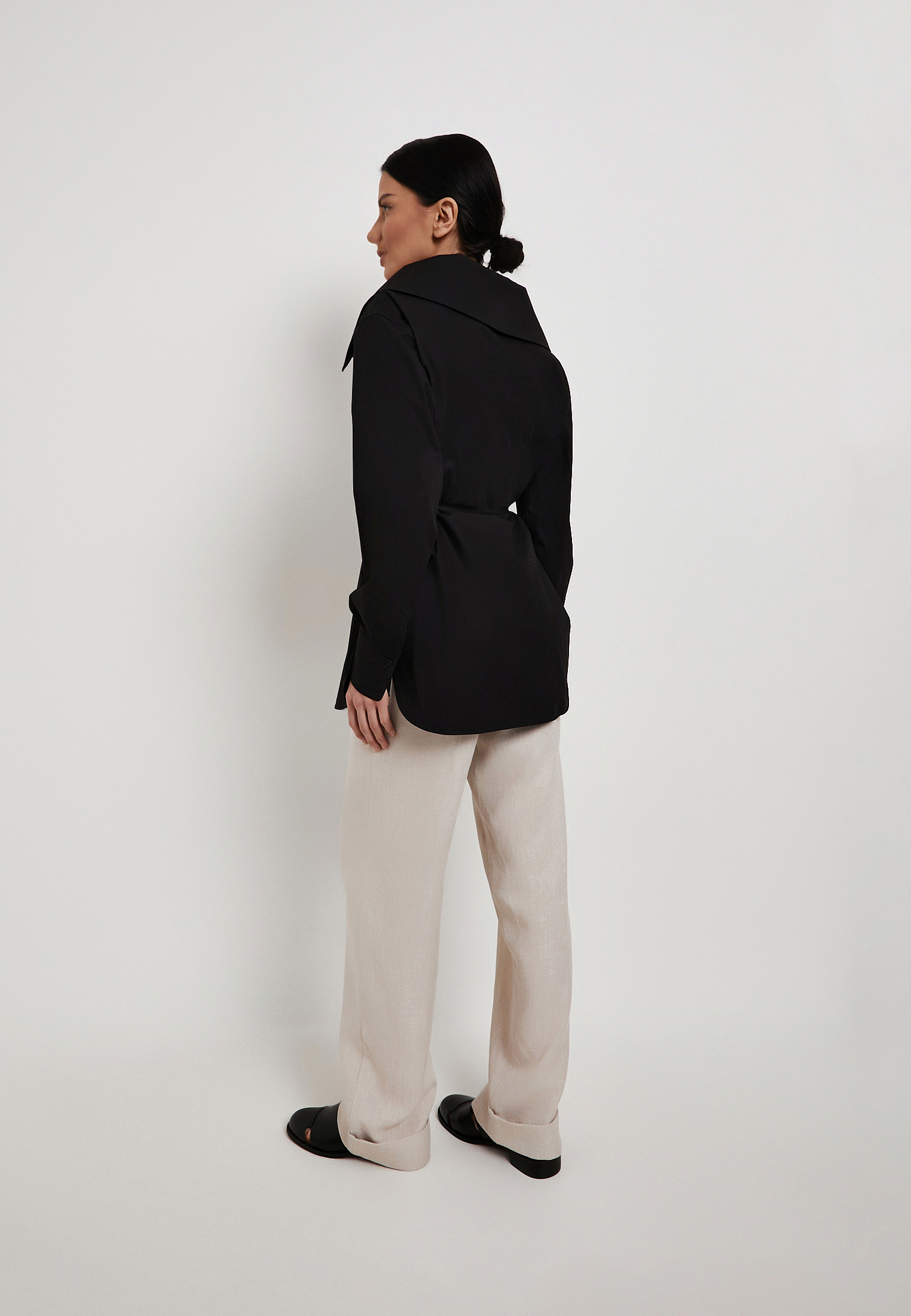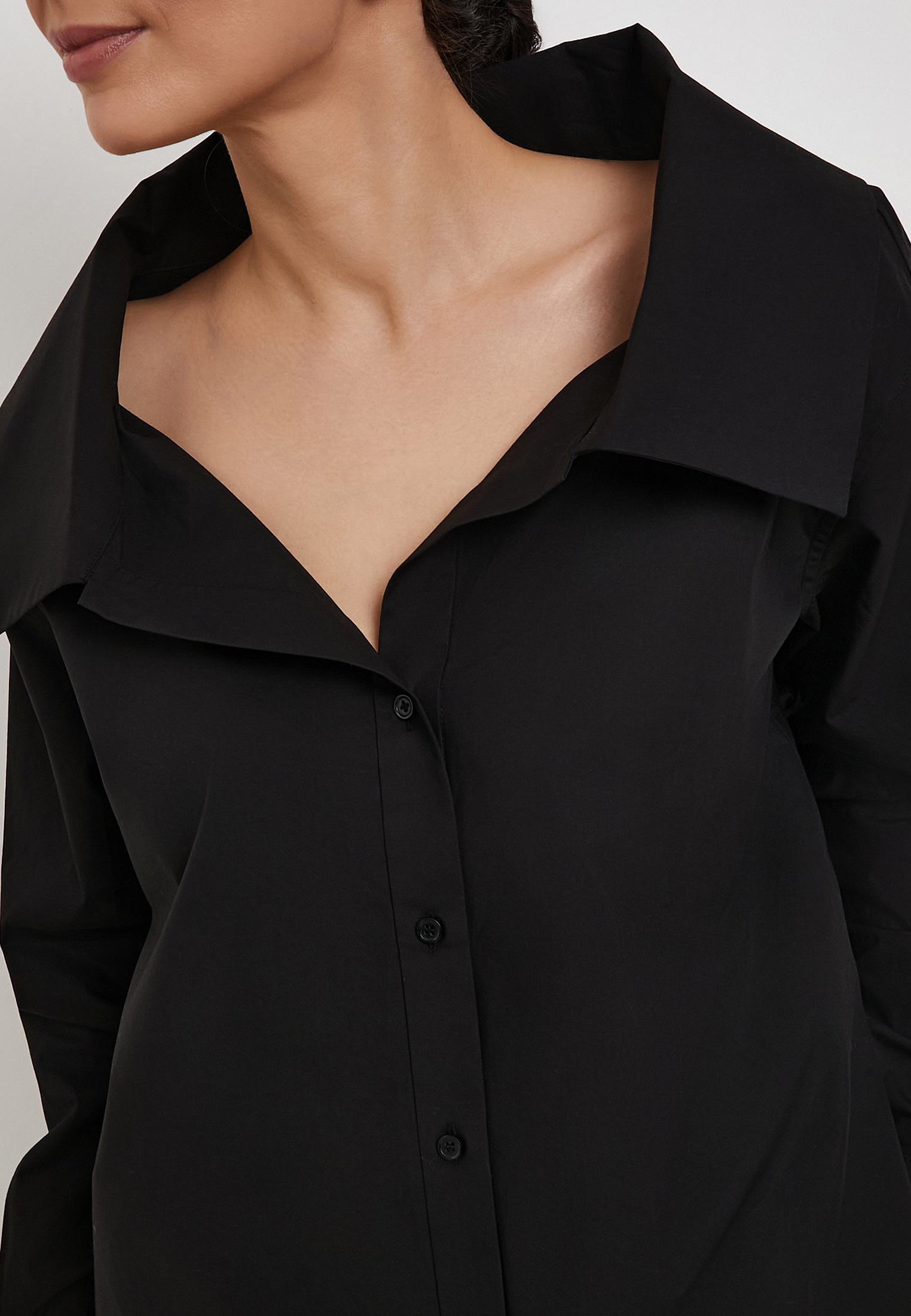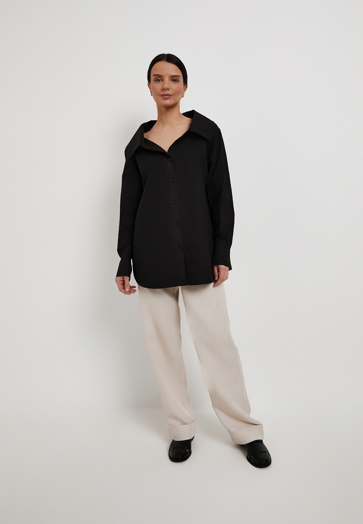 - Черная рубашка Mascotte из 100% натурального хлопка станет стильной основой для офисных и повседневных образов. Легкий дышащий материал гипоаллергенен и обеспечивает комфорт в течение всего дня. Модель выделяется выразительным отложным воротником с расширенным вырезом горловины, который добавляет образу женственности и утонченности. Удлиненный свободный силуэт визуально стройнит, а пояс-завязки из основной ткани позволяют подчеркнуть талию и создать аккуратные пропорции. Высокие манжеты служат дополнительным акцентом и придают дизайну характер. Рекомендуется ручная стирка до 30 °C с деликатным отжимом, вертикальная сушка в тени и глажка при температуре до 110 °C, отбеливание запрещено, допустима щадящая химчистка. На модели размер S, параметры: 83-60-92, рост 172 см. Рубашка также доступна в белом цвете.
