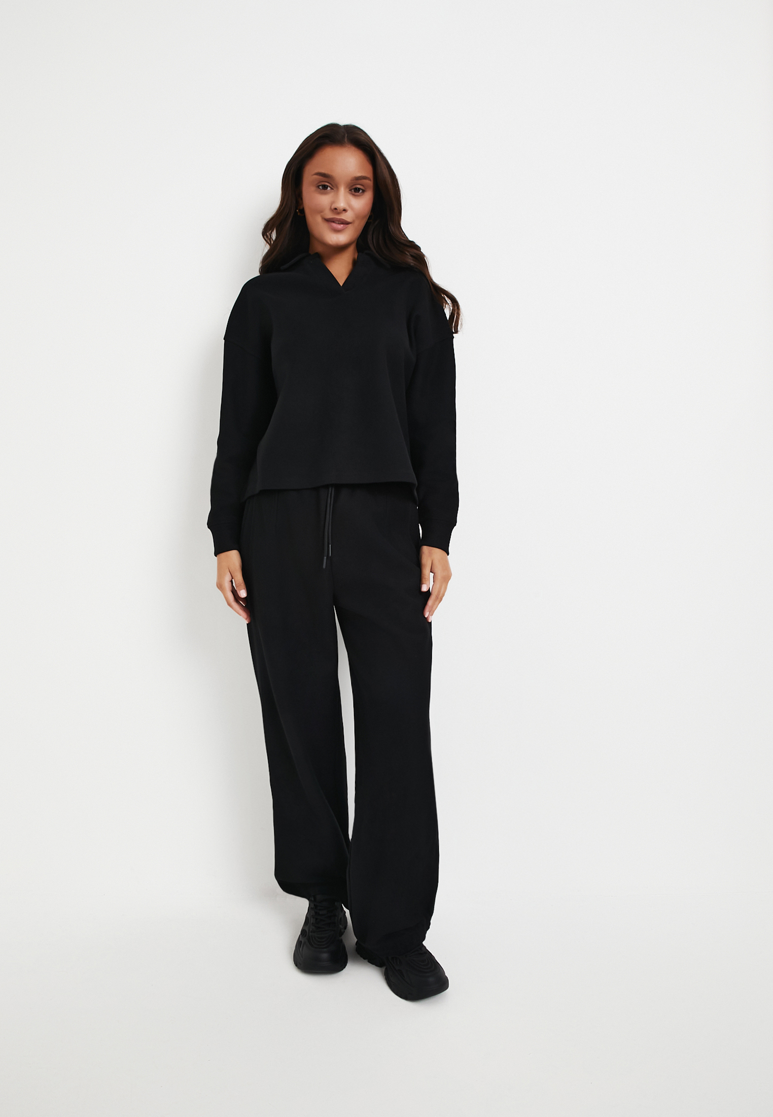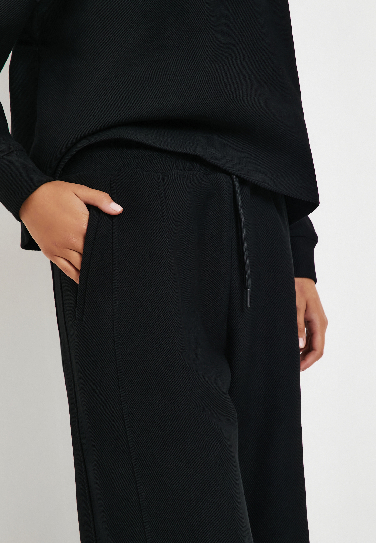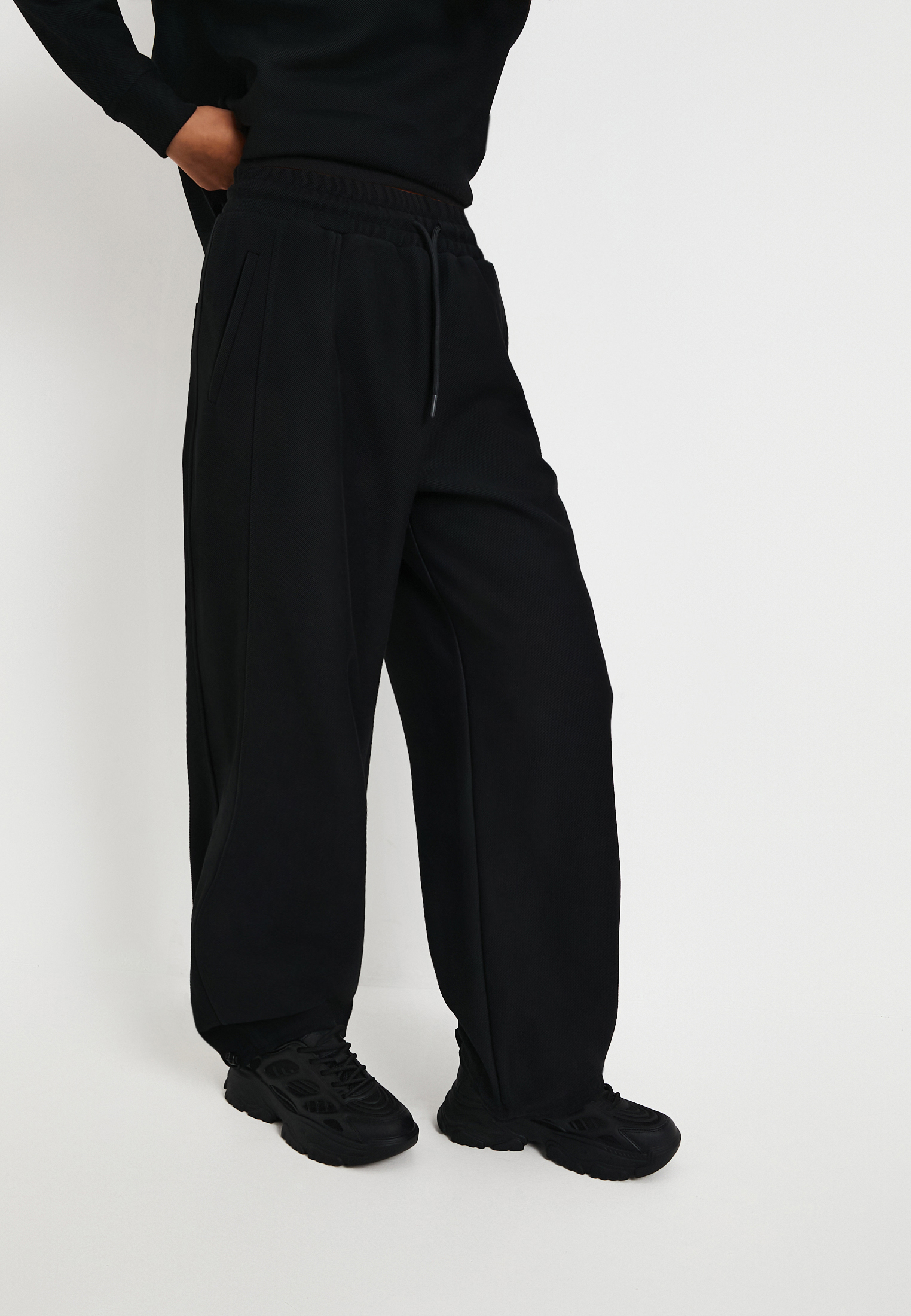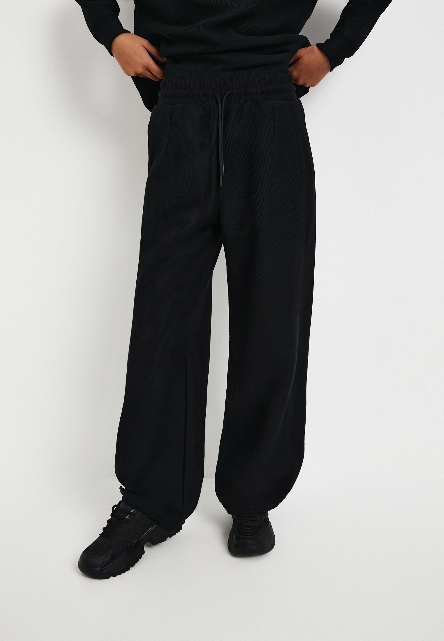 - Черные женские брюки Mascotte - стильный выбор для создания комфортного и современного образа. Модель выполнена из прочного, комбинированного материала: 70% хлопка и 30% полиэстера, обеспечивающего долговечность и приятные тактильные ощущения. Плотность материала составляет 320гр/м2, что гарантирует хорошую форму и устойчивость к деформации. Внутренняя сторона материала гладкая для максимального комфорта, а внешняя обладает выразительной текстурой, придающей характер изделию. Брюки свободного кроя, слегка зауженные к низу с округлым силуэтом, дополнены декоративными боковыми швами, придающими оригинальность. Удобный эластичный пояс оснащен регулируемым шнуром для идеальной посадки по фигуре. Для дополнительной фиксации предусмотрены стопперы на шнурке, а также регулятор объема внизу. Боковые карманы добавят удобства и сделают эти универсальные брюки более практичными для ежедневного использования. На модели размер S. Параметры модели: 88-60-91, рост 173