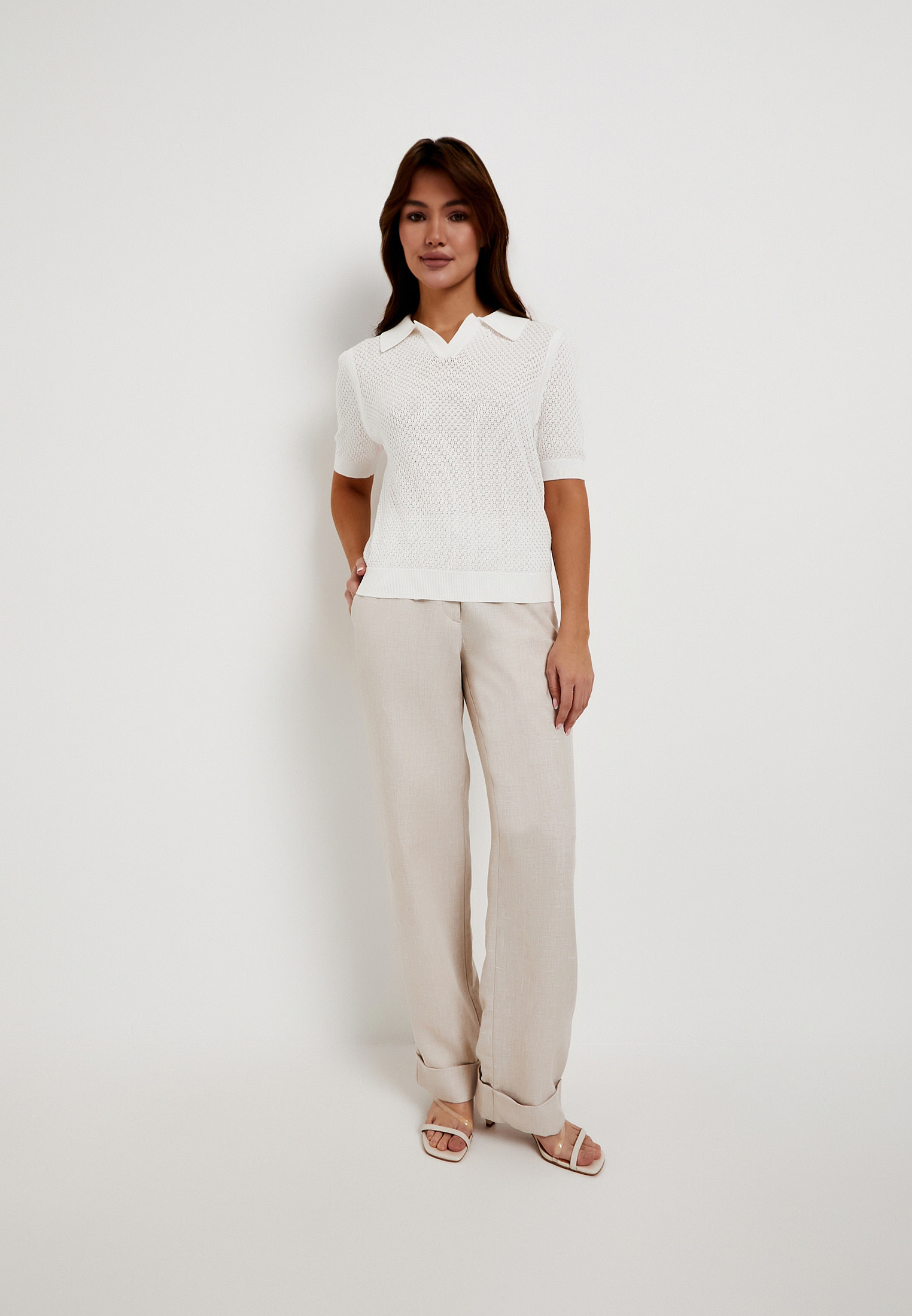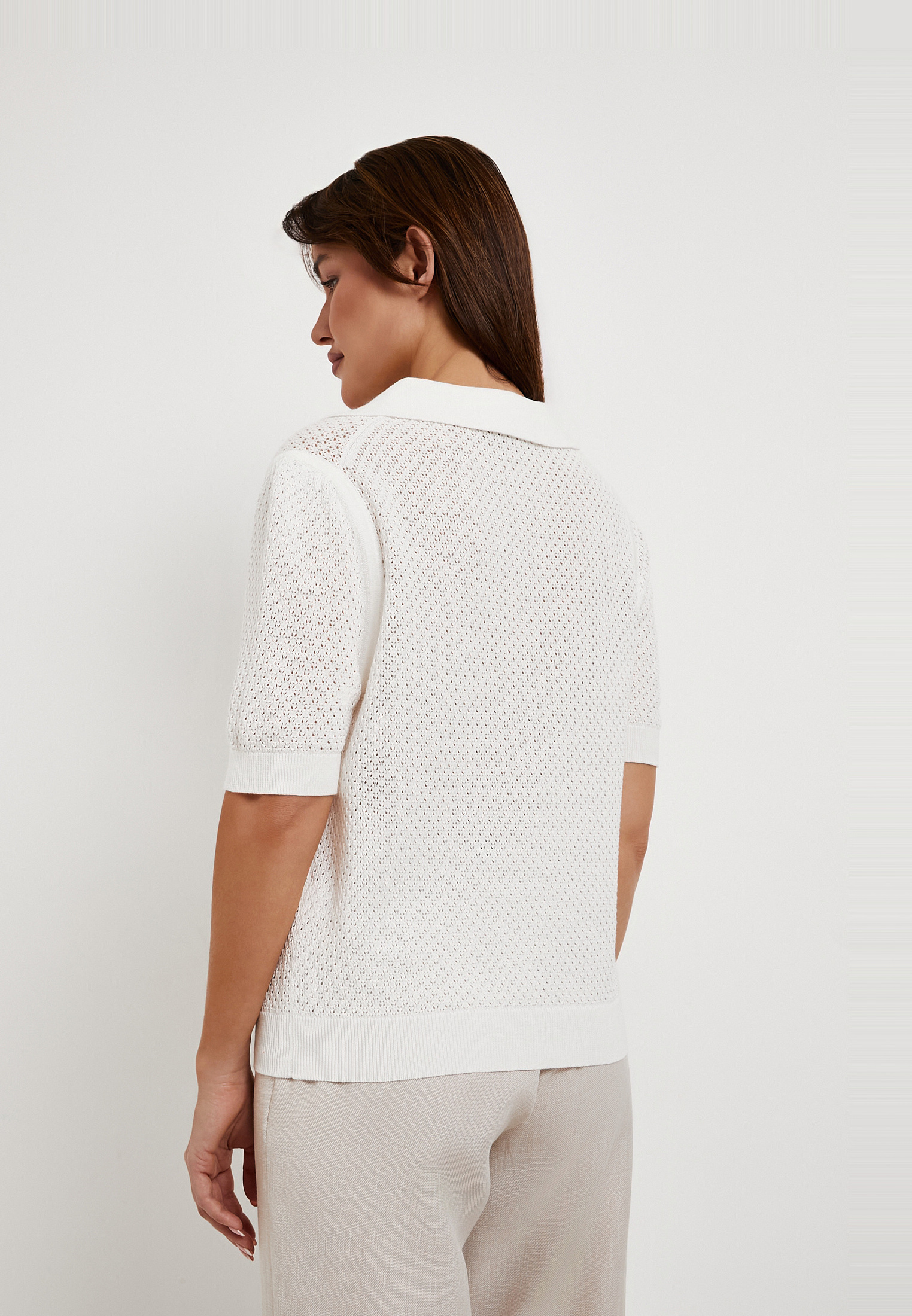 - Белая женская футболка-поло Mascotte - стильная и универсальная модель для летнего сезона, в которой сочетаются элегантный внешний вид и комфорт в носке. Мягкий трикотаж с преобладанием натурального хлопка (53% хлопок, 42% вискоза, 5% шелк) обеспечивает хорошую воздухопроницаемость, нежную текстуру и ощущение прохлады в теплую погоду. Прямой силуэт и воротник-поло без застежки формируют лаконичный, легко комбинируемый дизайн, а декоративная ажурная вязка придает образу легкость и изящность. Модель отлично сочетается с джинсами, юбками и легкими брюками, подходя для повседневных образов. Для сохранения внешнего вида рекомендуется деликатный уход: ручная стирка при температуре до 30°C без отбеливания и машинного отжима, горизонтальная сушка в тени и глажка до 110°C. При необходимости возможна щадящая химчистка. На модели размер S, параметры: 82-57-90, рост 172 см. Футболка также представлена в красном цвете.