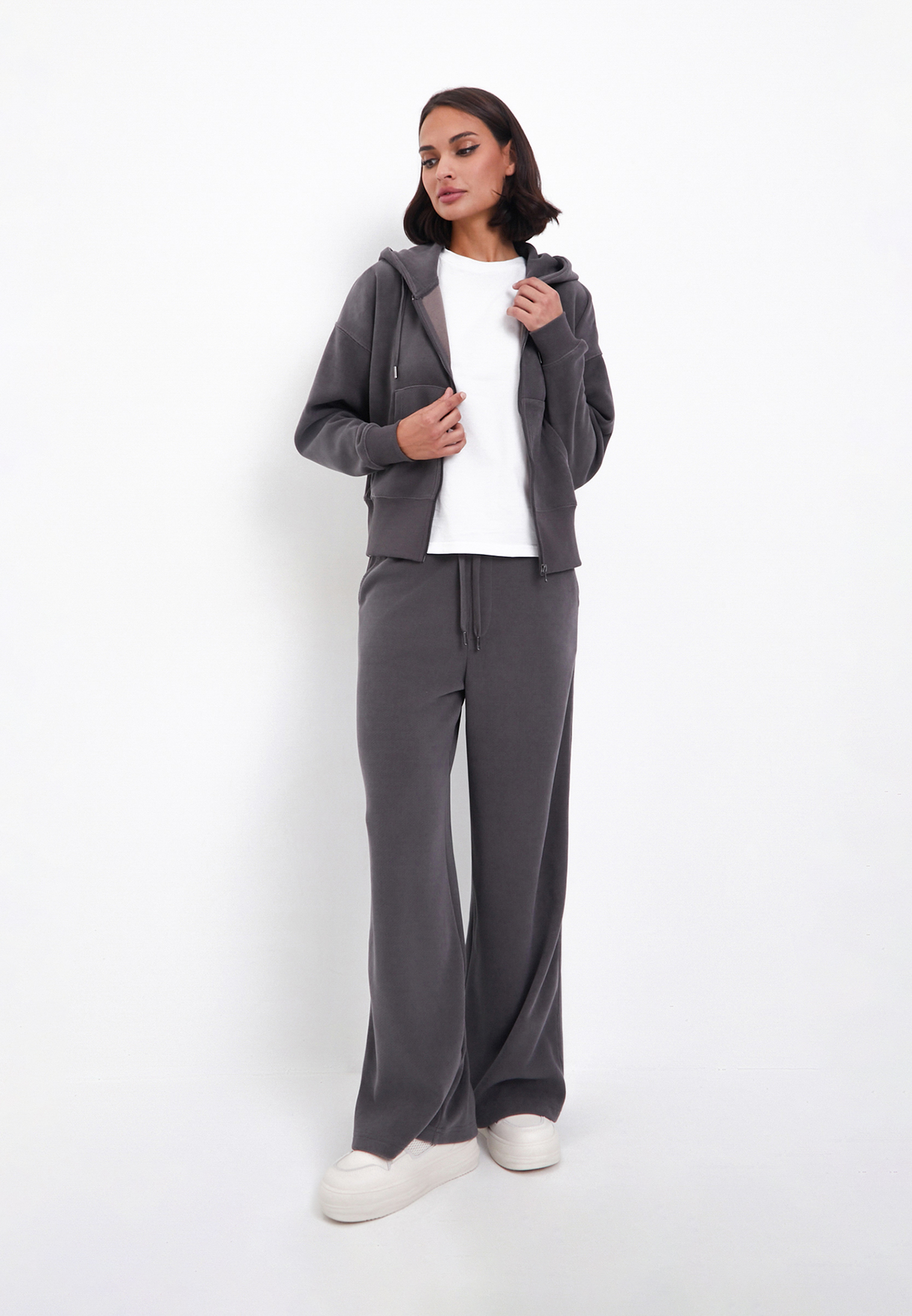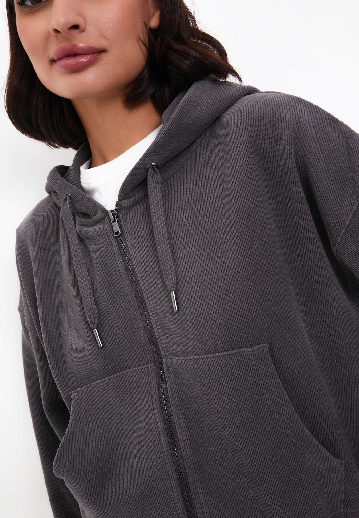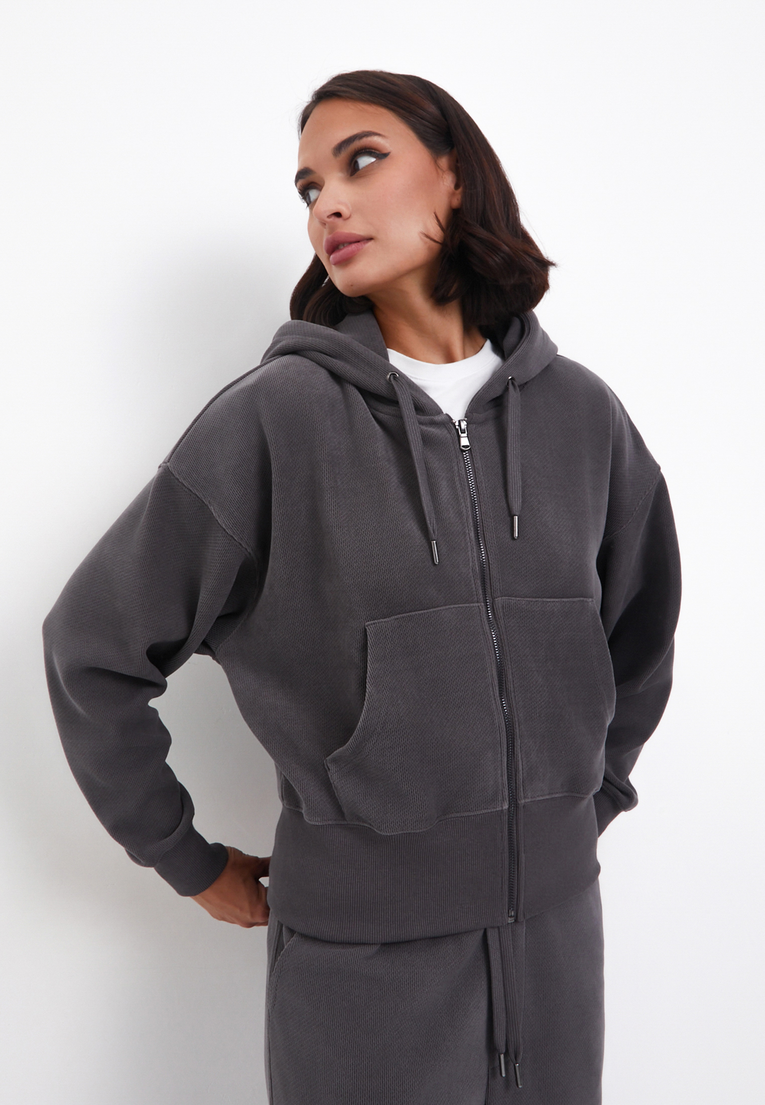 - Женское худи из трикотажа из новой коллекции Mascotte понравится любителям свободного кроя и комфорта. Изготовлено из мягкого материала: 98% полиэстера и 2% спандекса. Такое сочетание обеспечивает прочность изделия, улучшает воздухопроницаемость, а пористая фактура приятна на ощупь.Модель с прямым широким кроем имеет два боковых кармана. Молния позволяет быстро застегнуть худи, а эластичные манжеты из рибана на рукавах и нижнем крае изделия помогут подстроить его под свой стиль. Выбирайте из двух цветов: графитовым или капучино. На модели размер S. Параметры модели: 84-62-92, рост 174. Рекомендуемая температура стирки – 30 градусов с деликатным отжимом, глажка до 110 градусов. Отбеливание и химчистка запрещены. Сушить изделие лучше в вертикальном положении. Со вкусом дополните образ брюками из набора арт. 888-4202-2409 и 888-4202-2410.