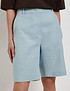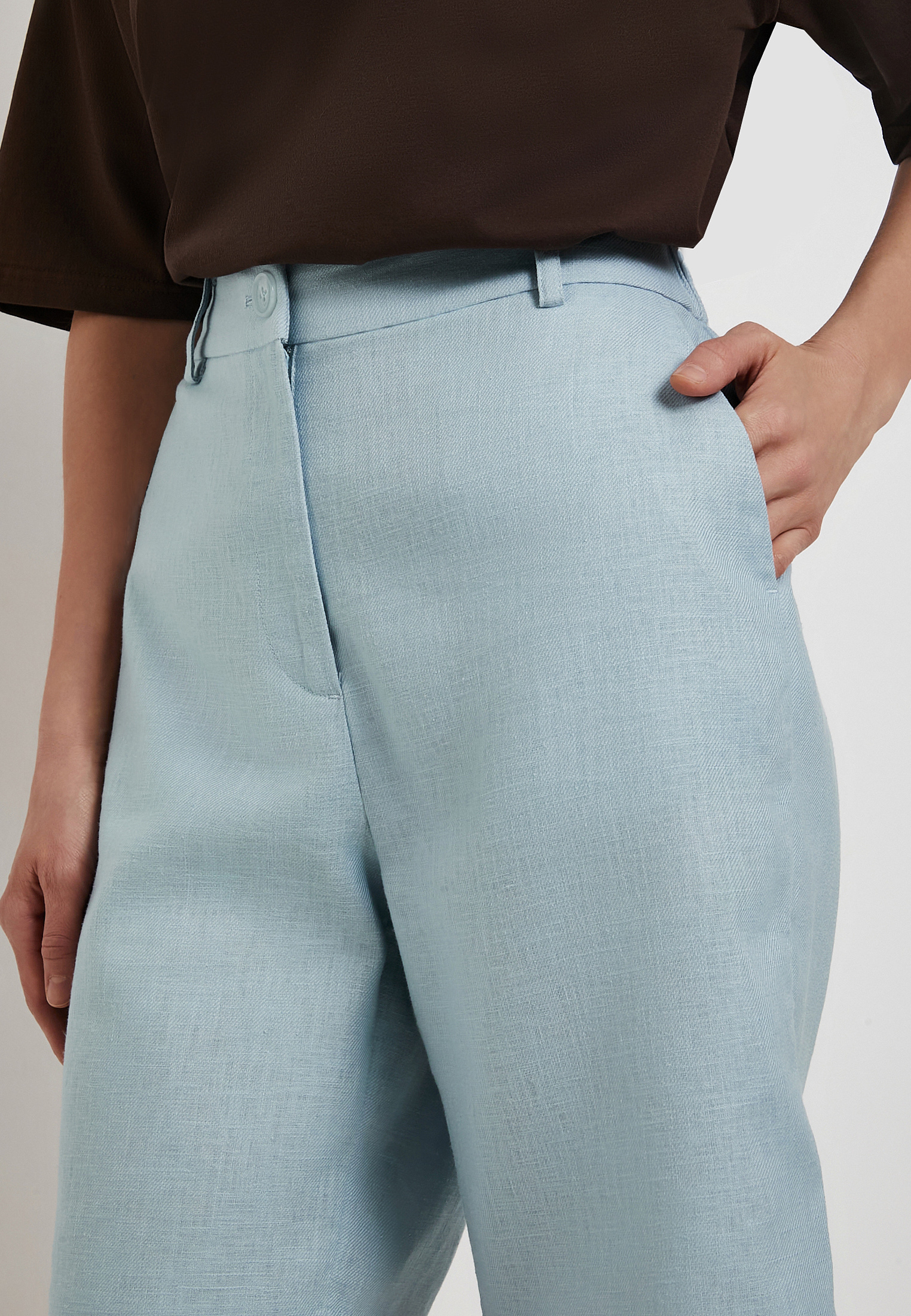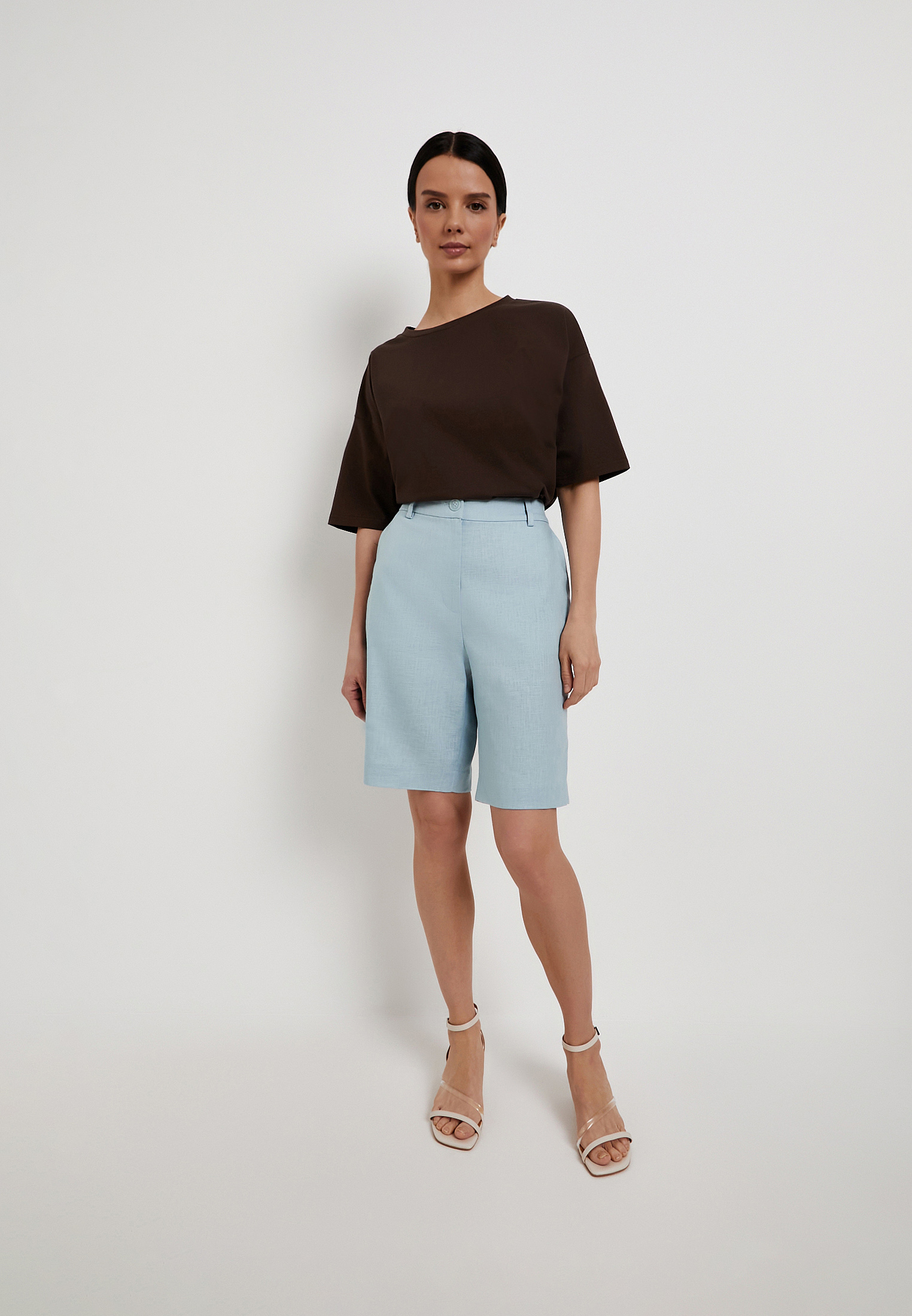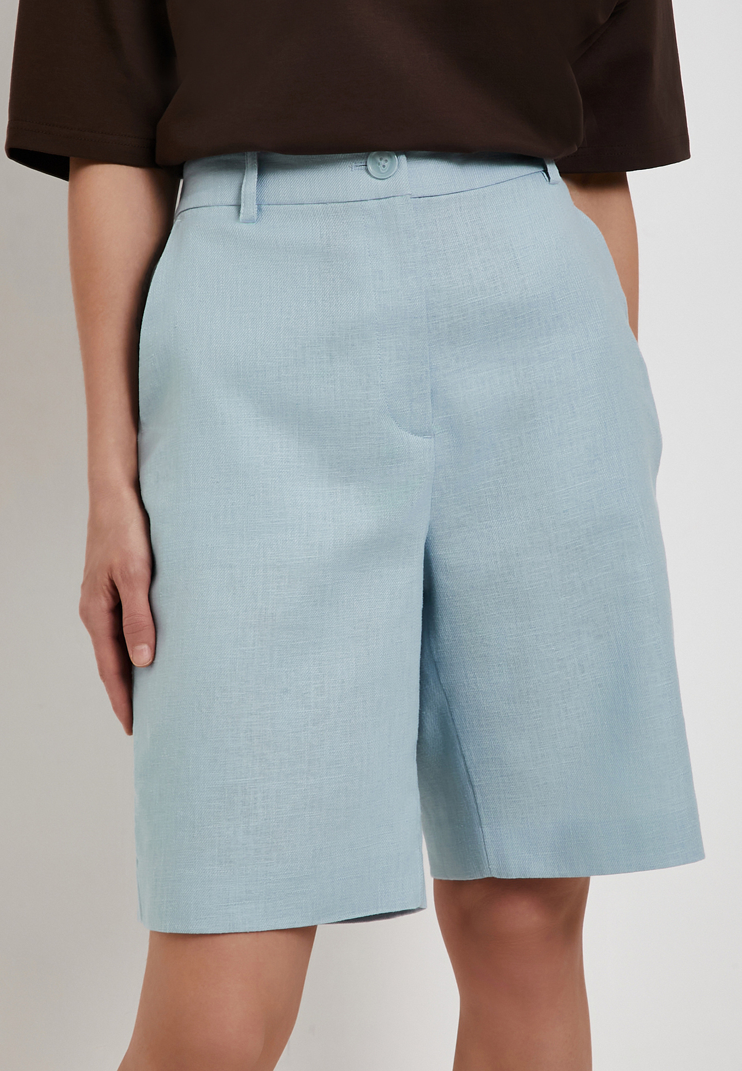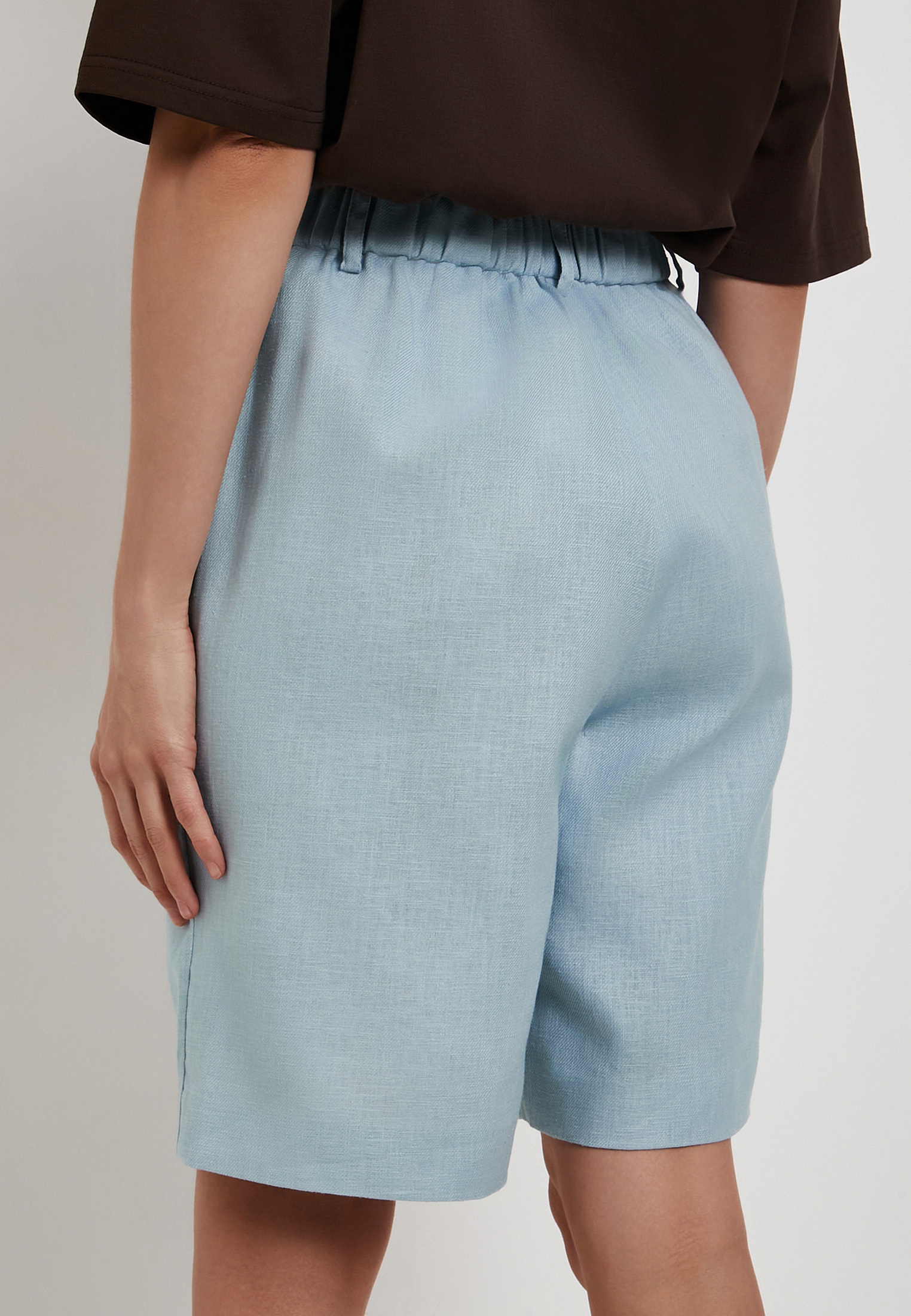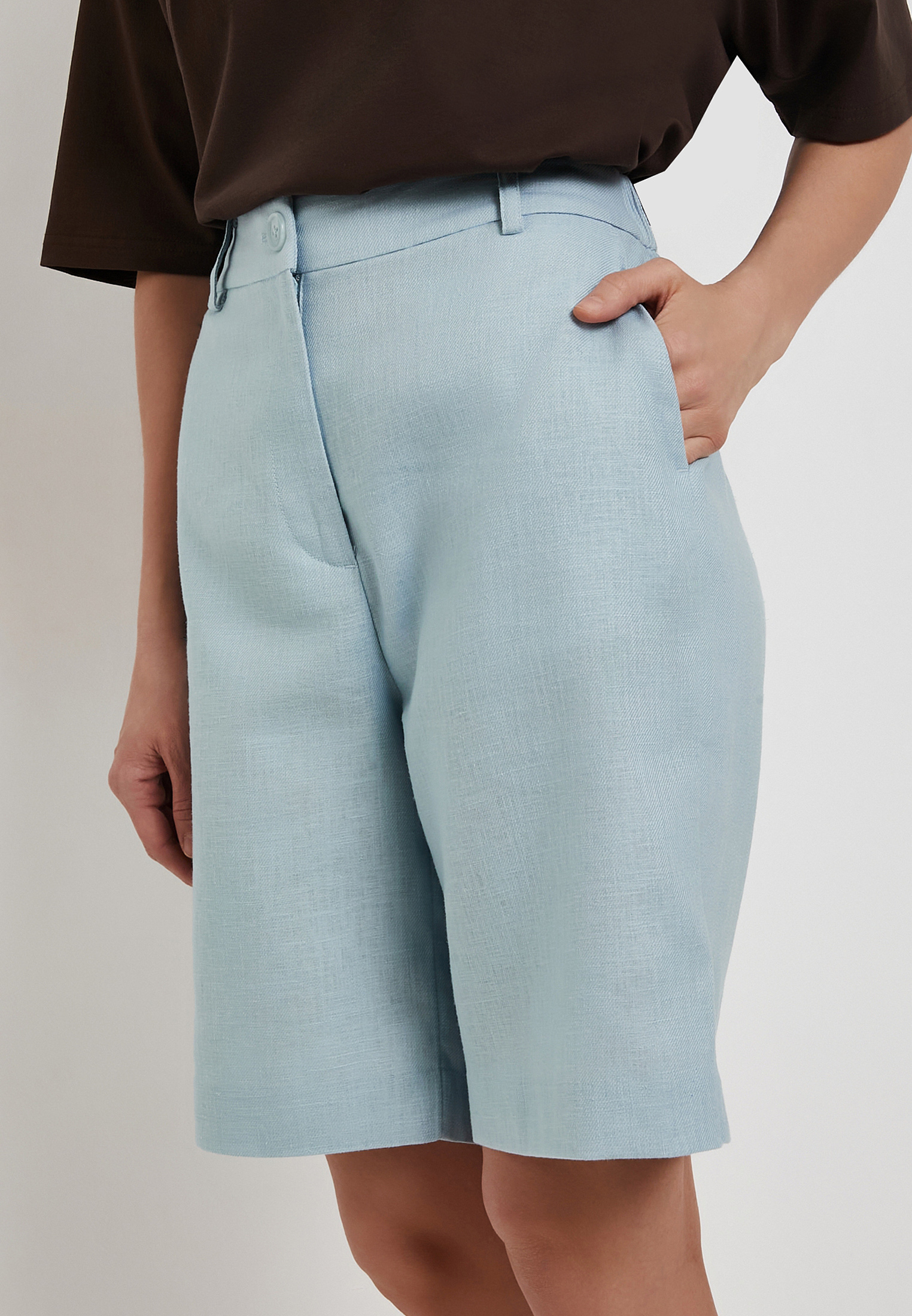 - Голубые женские шорты Mascotte выполнены из натуральной смесовой ткани (80% лен, 20% хлопок), которая хорошо пропускает воздух и обеспечивает комфорт в жаркую погоду. Модель отличается простым универсальным дизайном: прямой крой, удобная посадка и спокойный однотонный оттенок легко вписываются в повседневный летний гардероб. Застежка на молнию и пуговицу сохраняет аккуратный минималистичный вид, а эластичная резинка на задней части пояса помогает добиться более точной и комфортной посадки. Для сохранения качества ткани рекомендуется ручная стирка при температуре до 30 °C, деликатный отжим, вертикальная сушка в тени и глажка при температуре не выше 110 °C, отбеливание не допускается, возможна щадящая химчистка. На модели размер S. Параметры модели: 83-60-92, рост 172. Также шорты доступны в черном цвете.