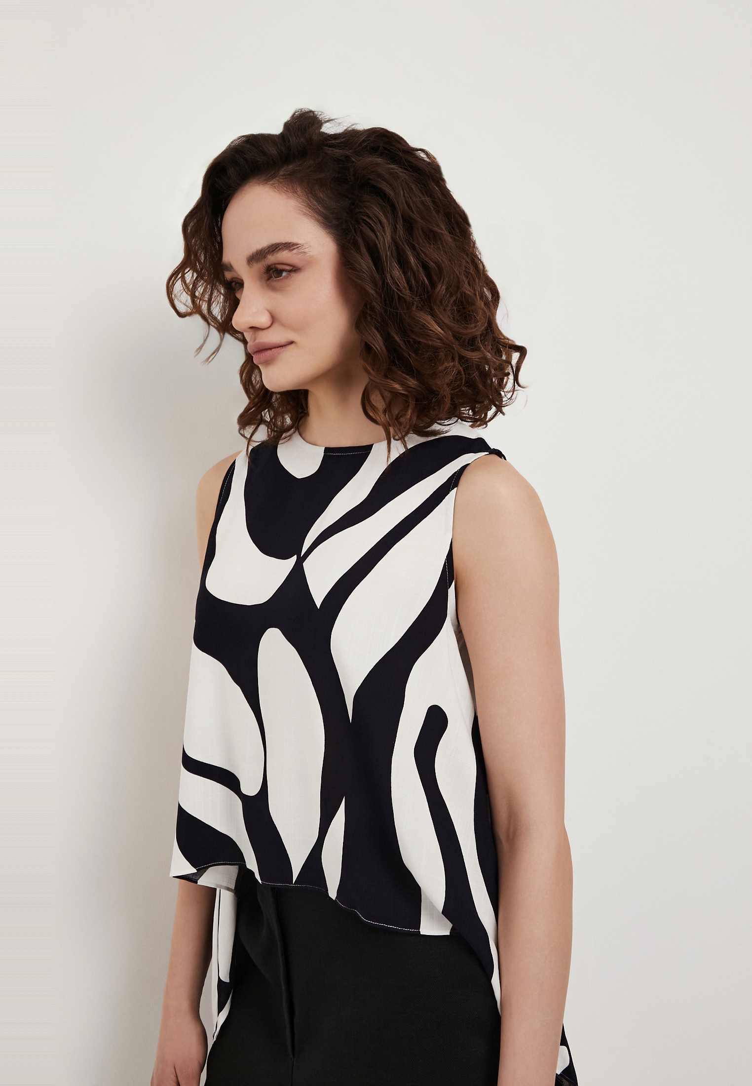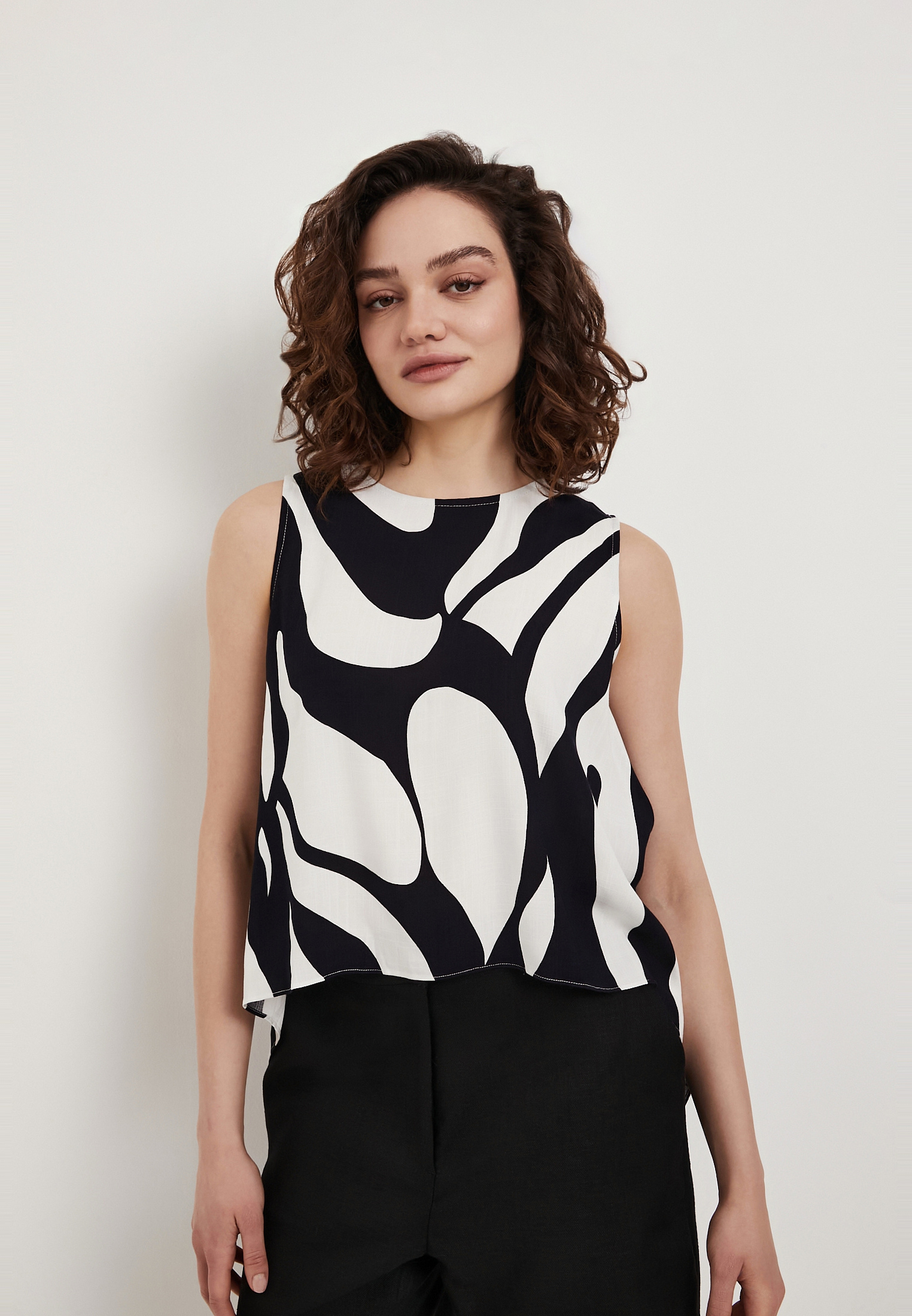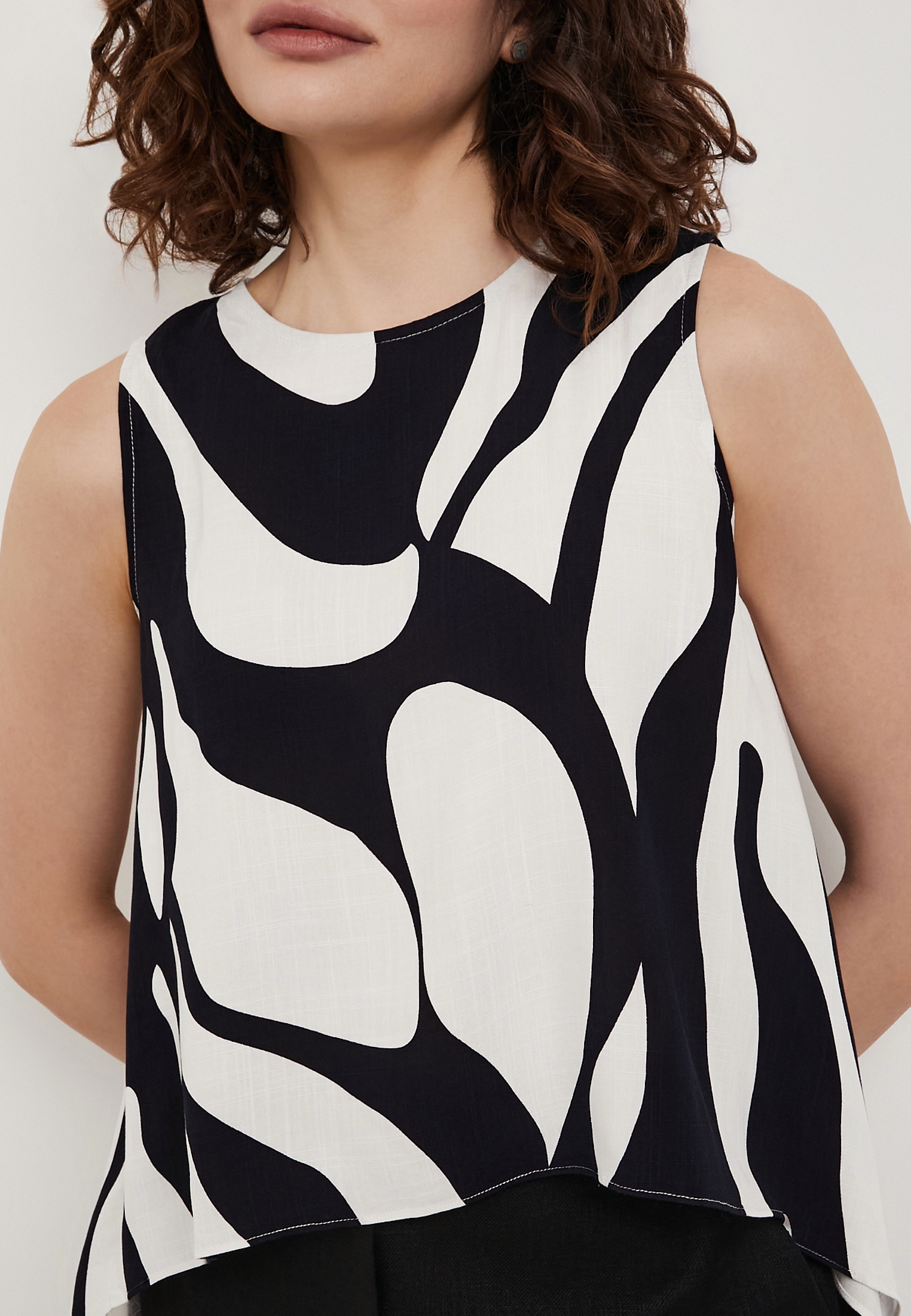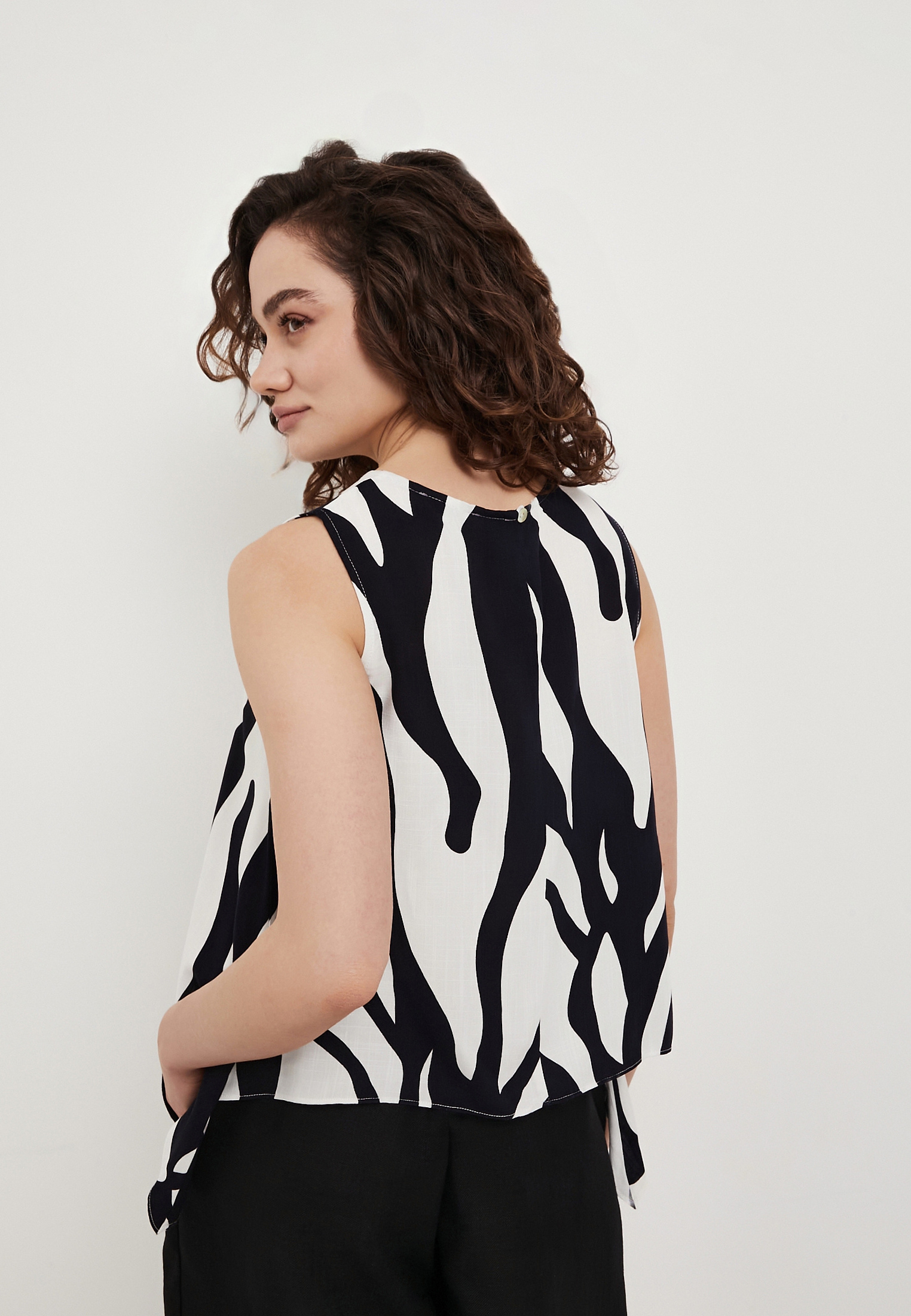 - Женский топ Mascotte с сине-белым принтом станет стильным и универсальным элементом летнего гардероба для повседневных образов. Модель выполнена из 100% вискозы - легкого дышащего материала, который обеспечивает комфорт даже в жаркую погоду благодаря хорошей воздухопроницаемости и приятной к телу текстуре. Мягкая, слегка шелковистая ткань не сковывает движения и сохраняет аккуратный внешний вид в течение дня. Топ отличается лаконичным дизайном с округлым вырезом горловины и фигурной линией нижнего края, которая добавляет образу оригинальности. Отсутствие рукавов обеспечивает свободу движений, а застежка на одну пуговицу сзади делает модель удобной в использовании. Свободный силуэт создает легкую и расслабленную посадку. Уход за изделием несложный: рекомендуется деликатная стирка при температуре не выше 30°C без отжима в центрифуге, вертикальная сушка в тени и глажка при температуре до 110°C. Отбеливание и химическая чистка не допускаются. Топ гармонично сочетается с брюками Mascotte из той же ткани арт. 973-6109-24031, формируя цельный и стильный летний комплект.