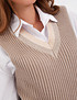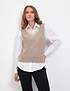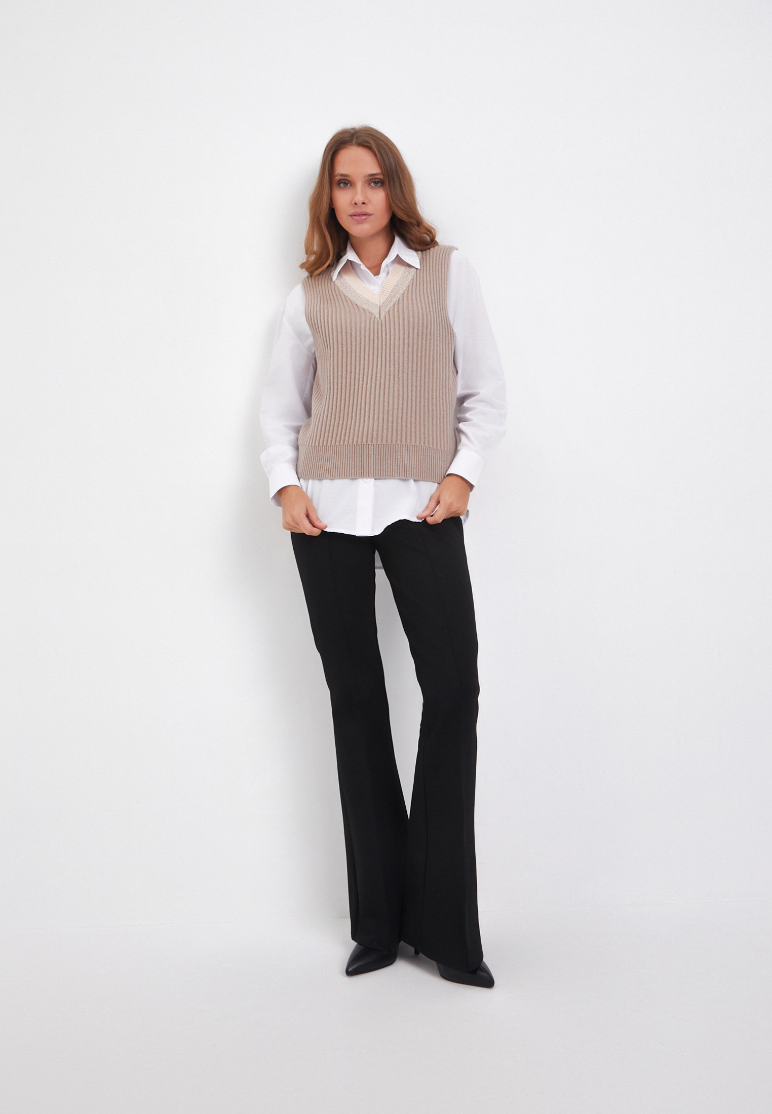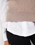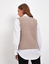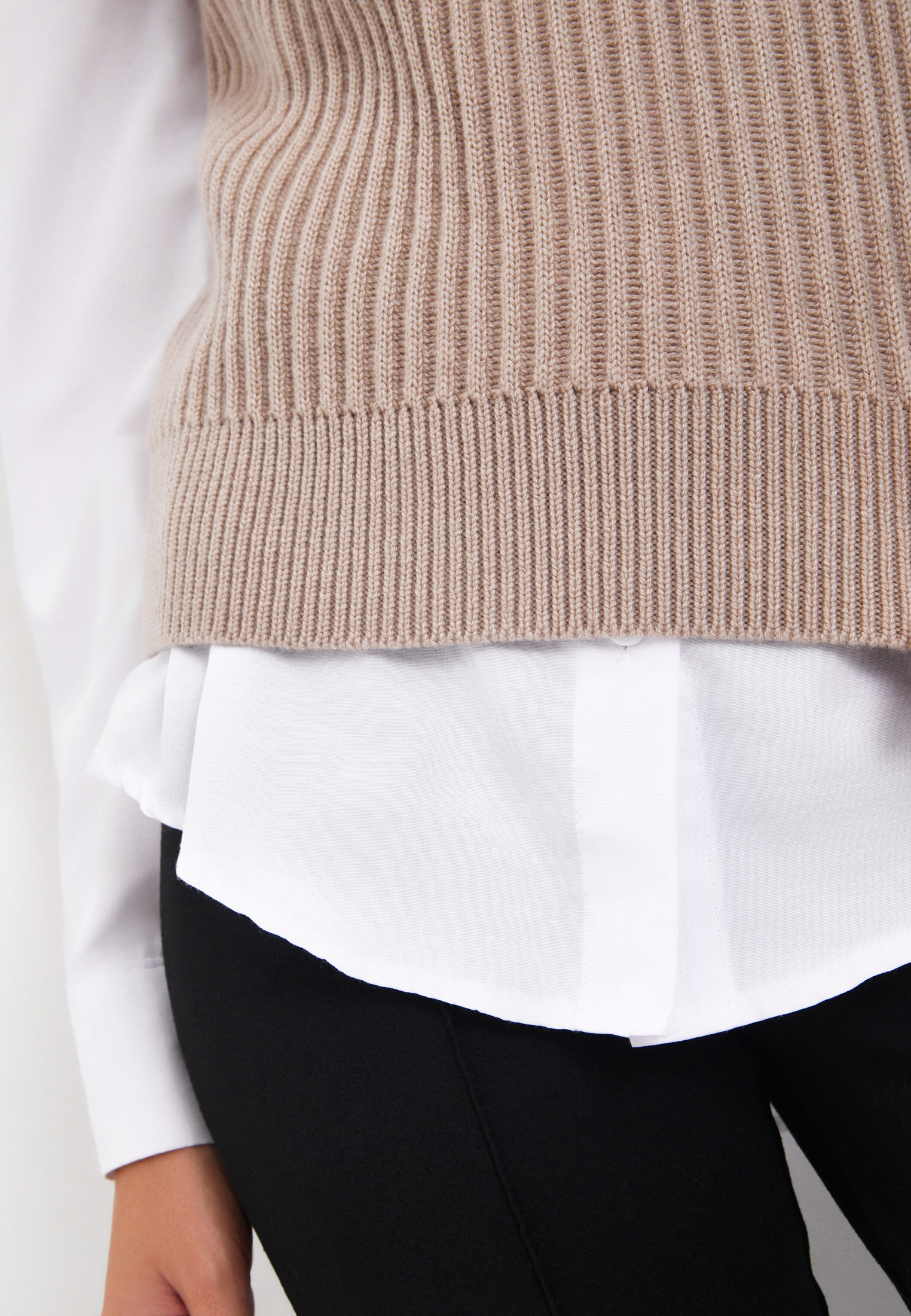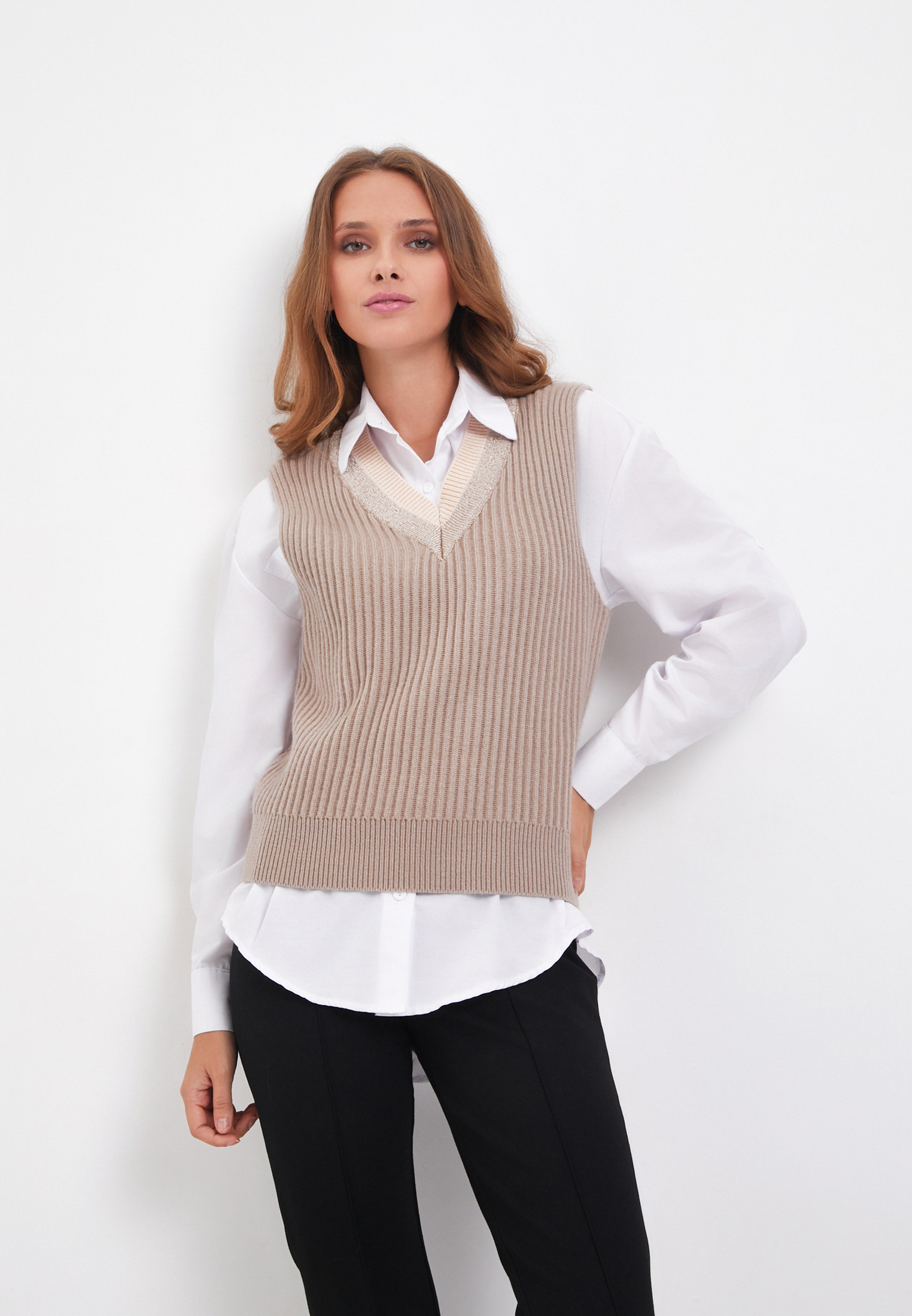 - Стильный и универсальный трикотажный жилет из коллекции Mascotte покорил сердца модниц этим сезоном. Для его создания использовали качественные материалы: 50% натуральная шерсть, 28% полиэстер и 22% нейлон. Такой состав гарантирует отличную теплоизоляцию, комфорт при носке и прочность изделия для ежедневного использования. Объемная вертикальная вязка и контрастный V-образный вырез горловины придают жилету особенный шарм. Отсутствие рукавов позволяет носить его с любыми блузками, футболками или лонгсливами. Эластичный край жилета создает свободный силуэт и добавляет удобства. Жилет представлен в двух цветах: бежевом и оттенке капучино. На модели размер S. Параметры модели: 85-59-89, рост 168. Рекомендуется ручная стирка, отбеливание и сушка в центрифуге запрещены. Сушить изделие следует горизонтально, гладить при температуре не выше 110 градусов.