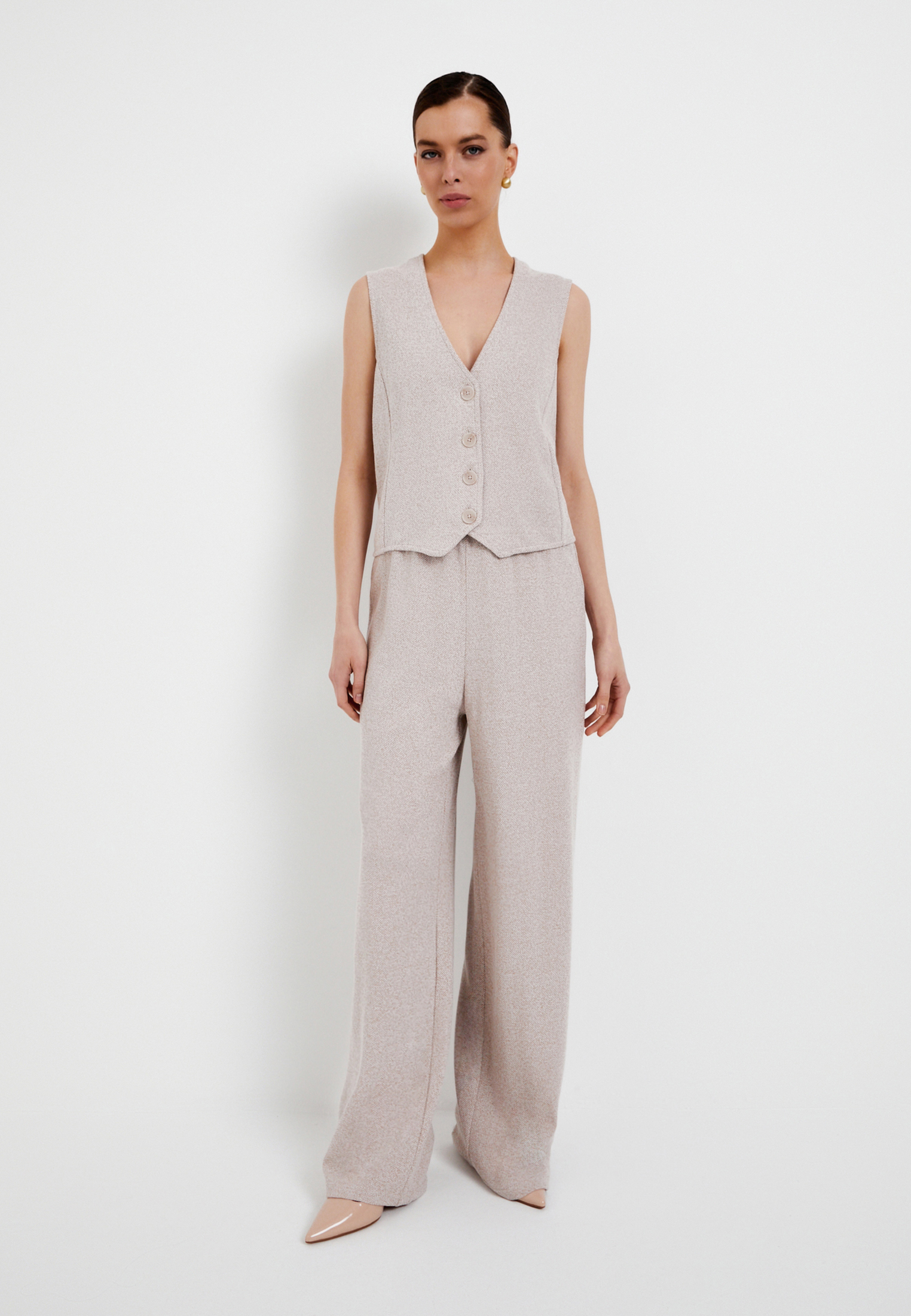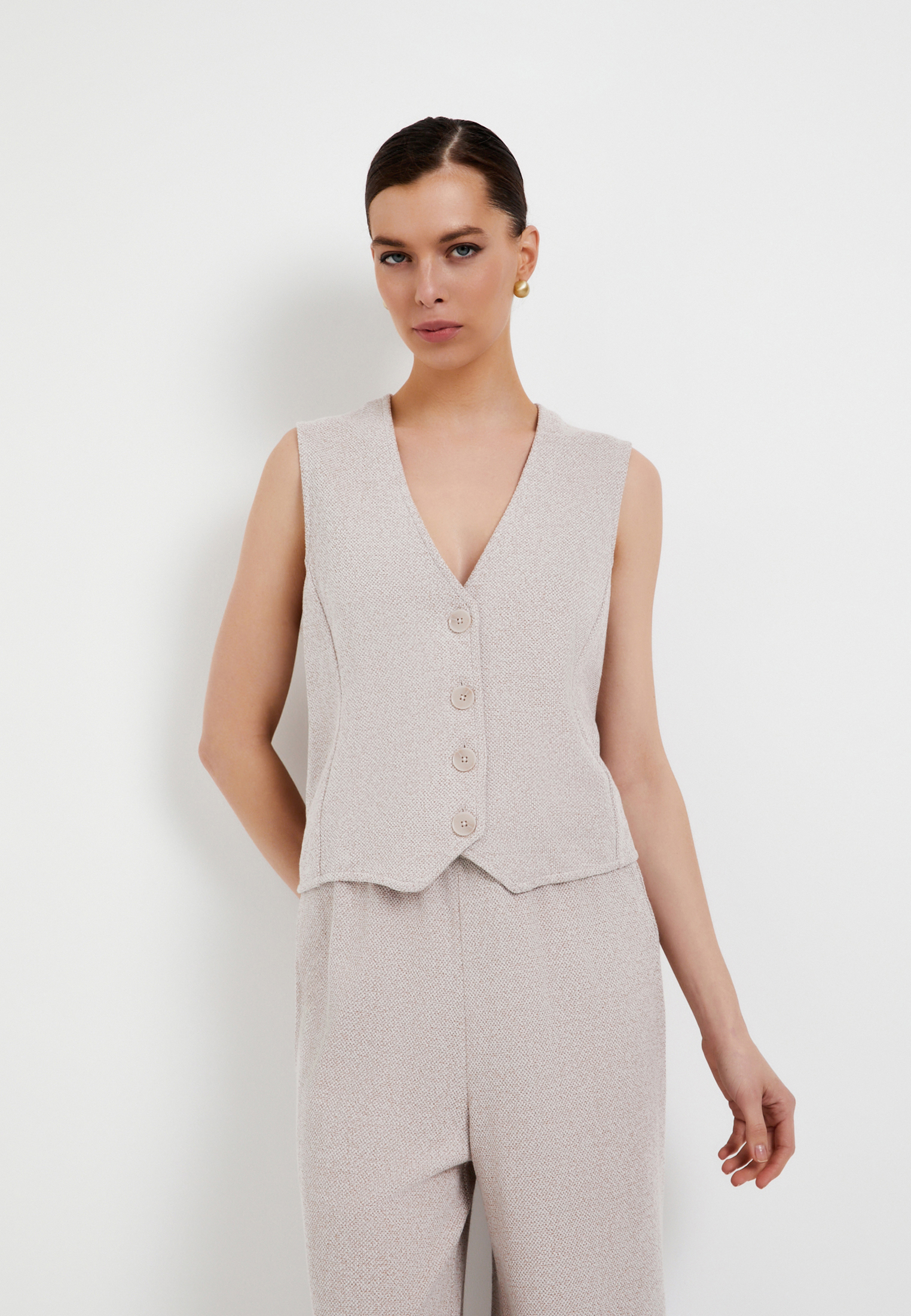 - Этот полуприлегающий женский жилет от Mascotte станет стильным и практичным дополнением вашего гардероба. Модель длиной до бедра идеально подходит для создания многослойных образов. Жилет выполнен из приятной на ощупь ткани, состоящей на 80% из хлопка и на 20% из полиэстера, обеспечивая отличную воздухопроницаемость. V-образный вырез горловины визуально удлиняет шею, а застежка на пуговицах добавляет элегантности. Бежевый цвет жилета позволяет легко сочетать его с различными стилями и оттенками. Этот женский жилет Mascotte без рукавов и карманов – прекрасный выбор для создания комфортного и модного образа. На модели размер S. Параметры модели: 85-61-91, рост 173.