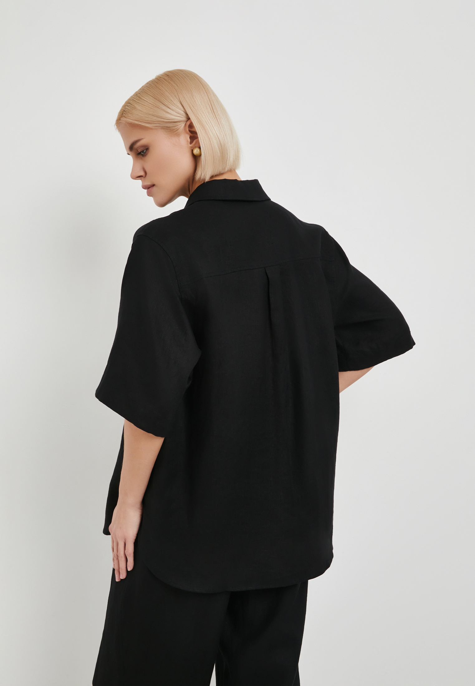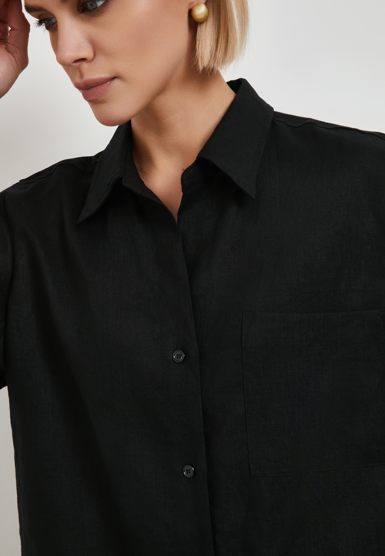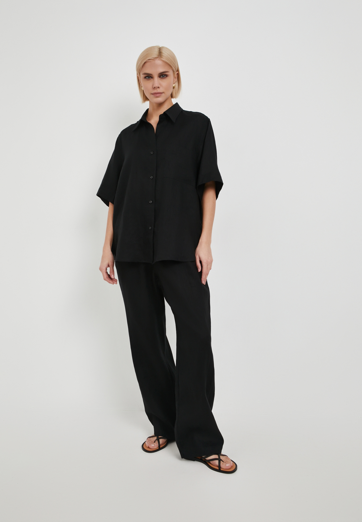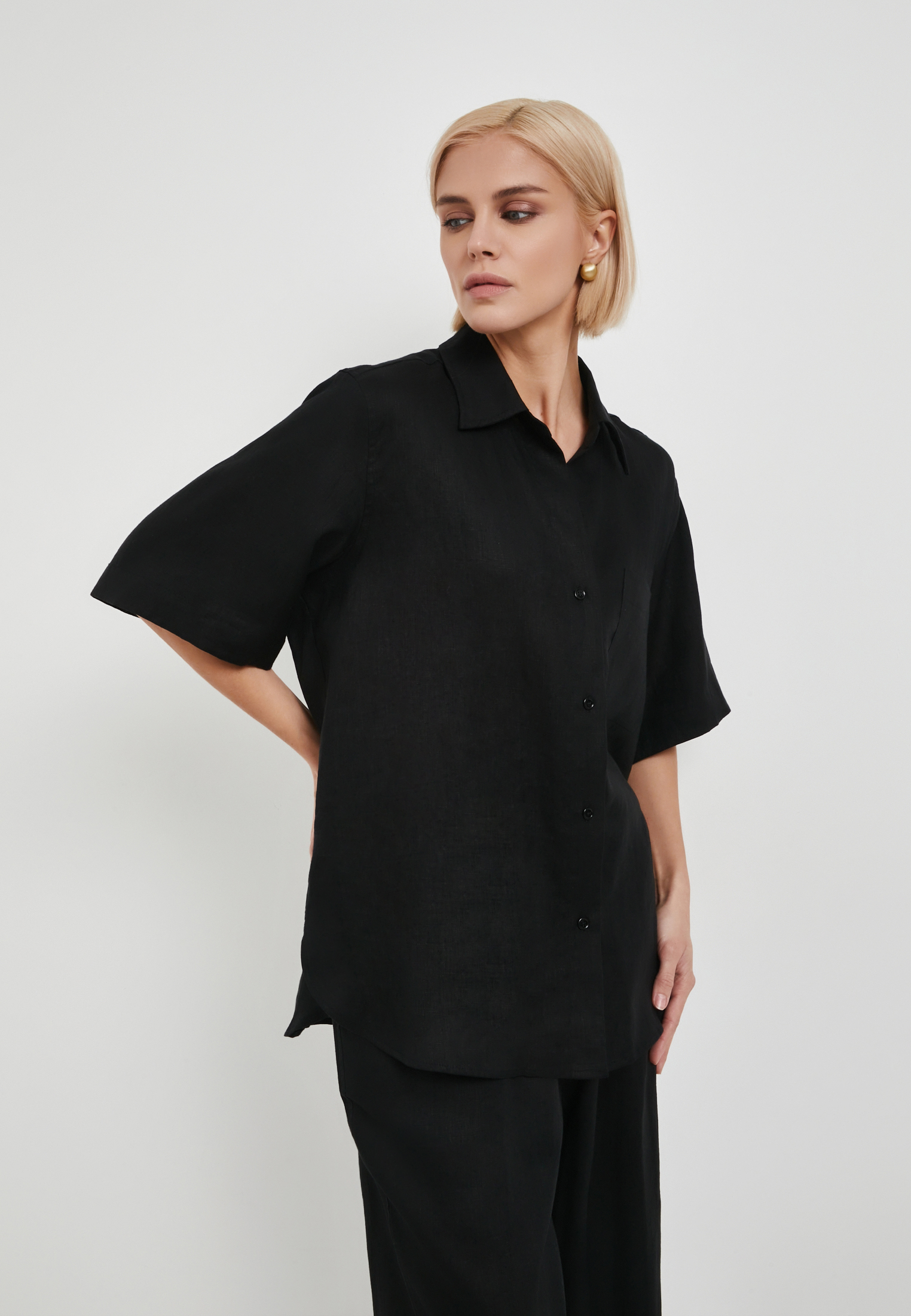- Эта свободная женская блузка от Mascotte – идеальное сочетание комфорта и стиля. Выполненная из 100% натурального льна, модель обеспечивает превосходную воздухопроницаемость, что особенно важно в теплую погоду. Блузка застегивается на пуговицы, имеет короткие втачные рукава и классический рубашечный воротник, что делает её универсальной для создания множества образов. Благодаря лаконичному дизайну без карманов, блузка выглядит элегантно и минималистично. Черный цвет изделия позволяет легко сочетать её с юбками, брюками или джинсами, создавая как повседневные, так и более формальные комплекты. На модели размер S. Параметры модели: 81-61-92, рост 175.