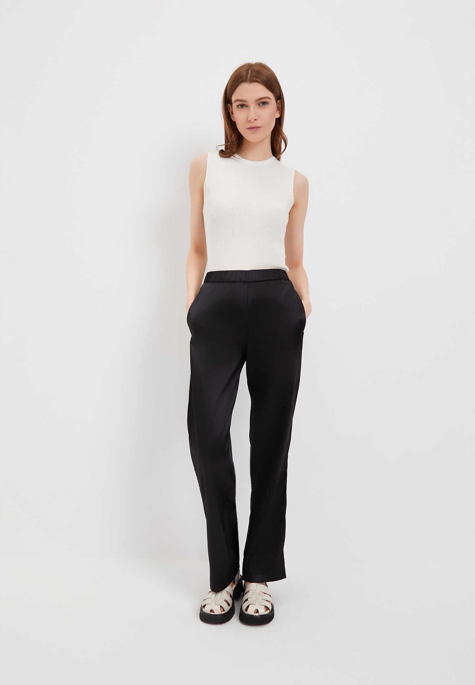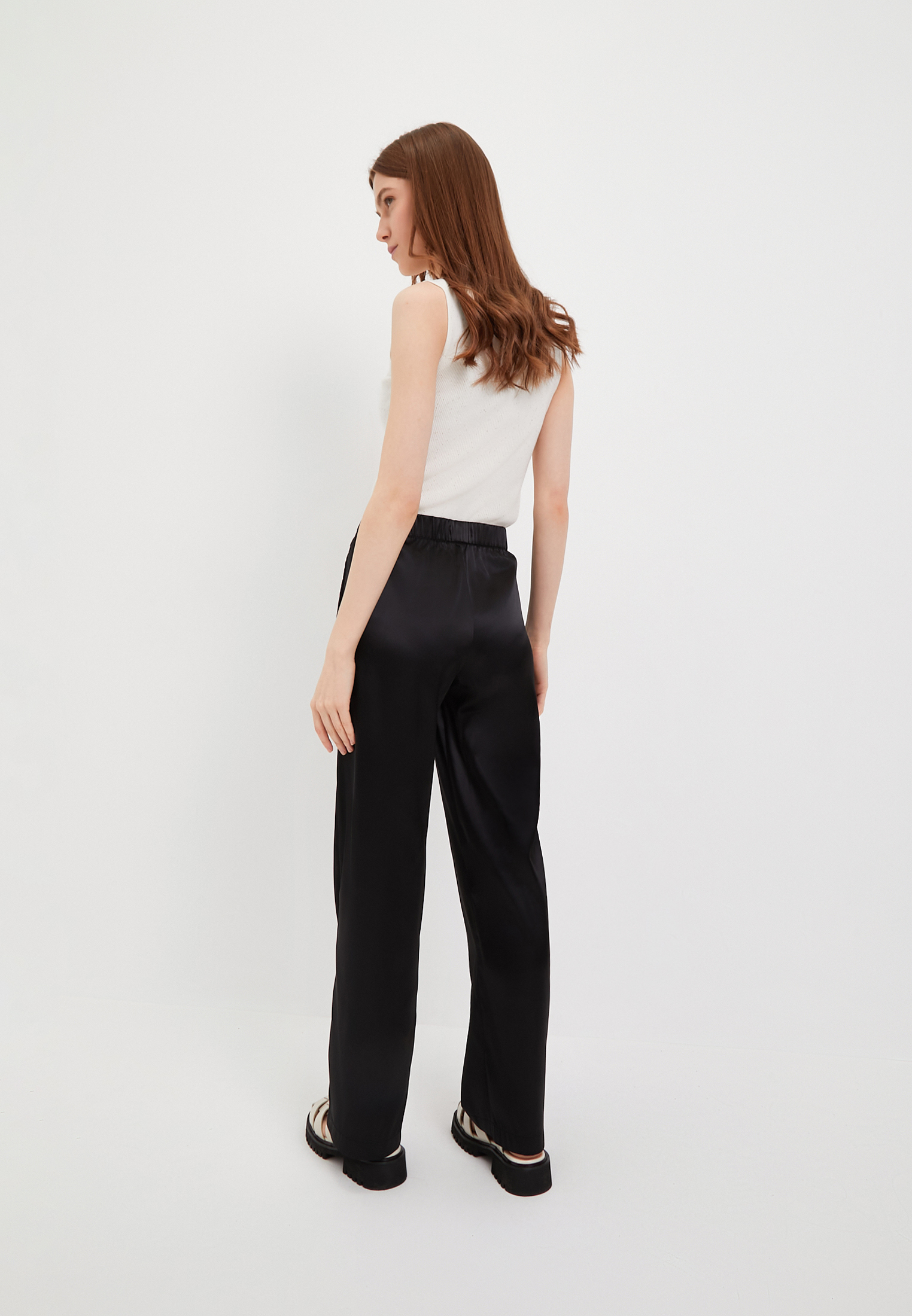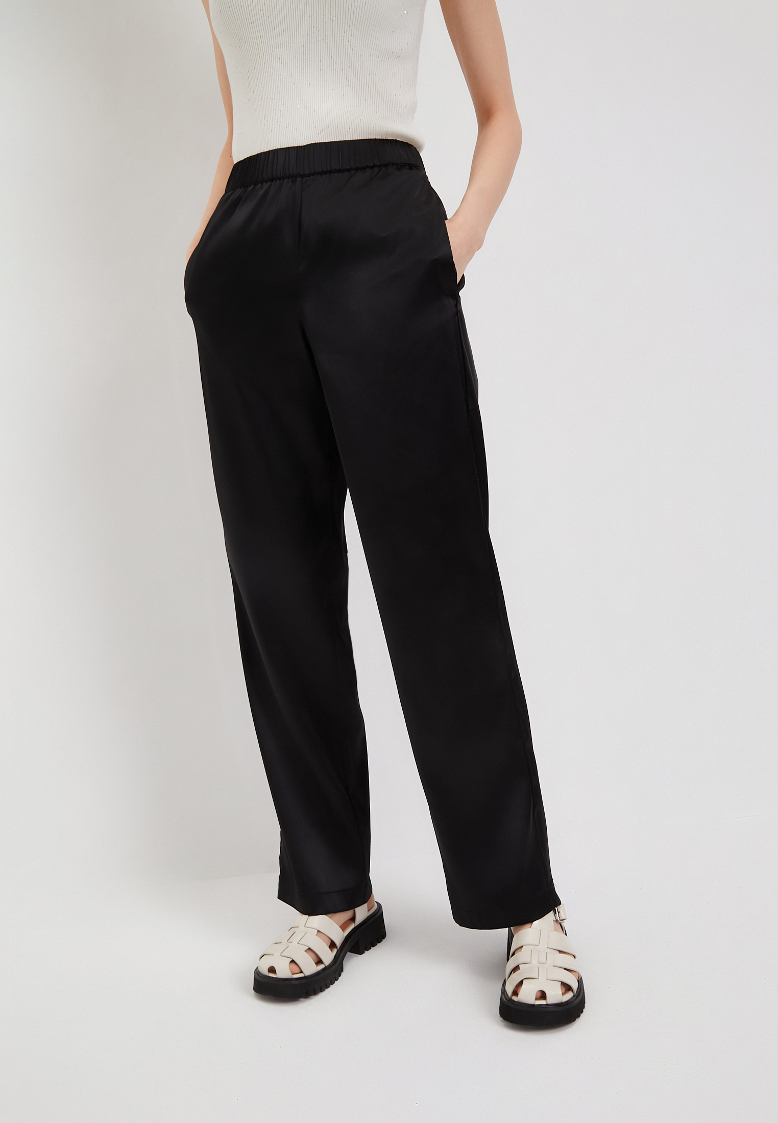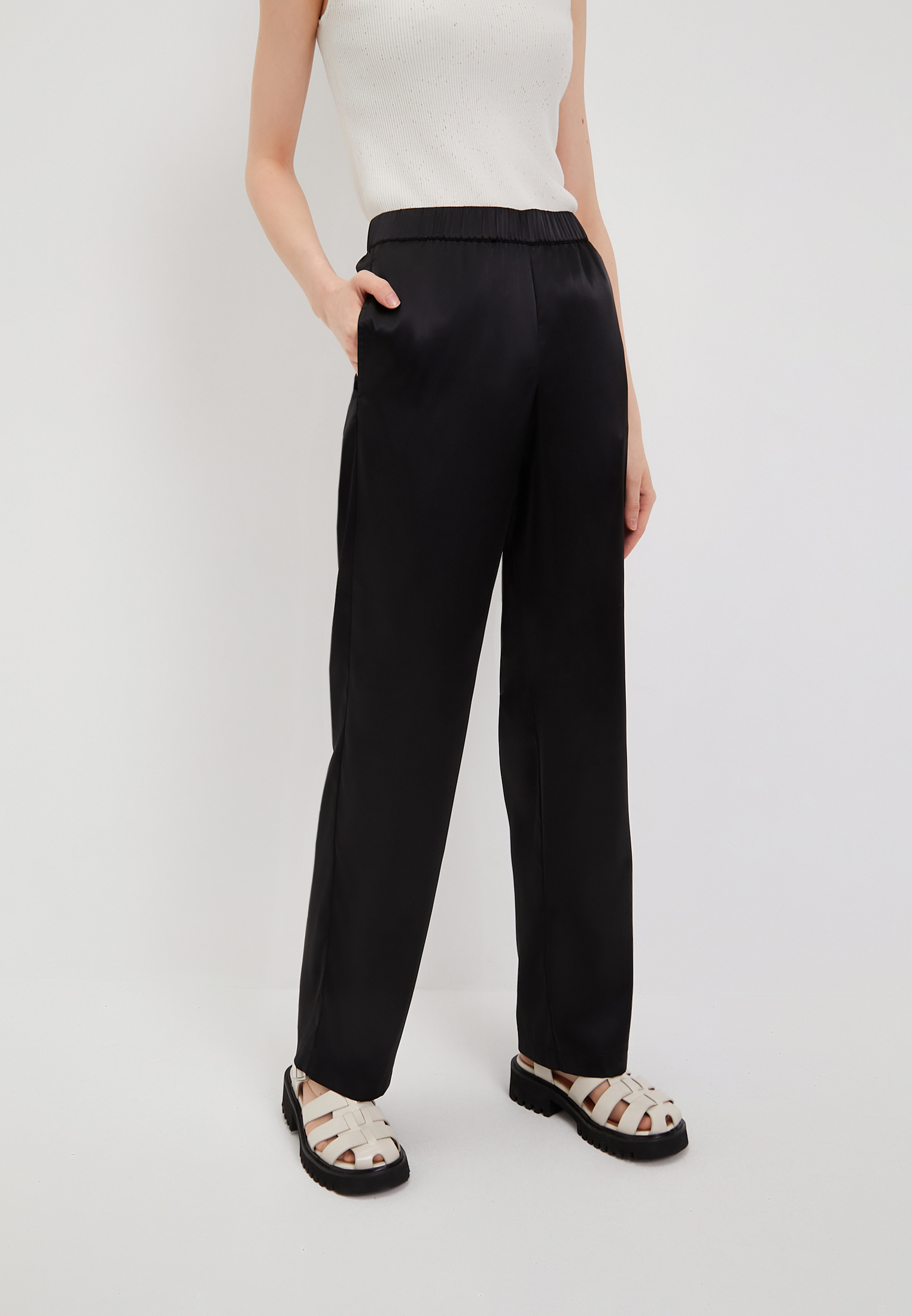 - Струящиеся женские брюки универсального черного цвета подойдут под любой гардероб и сейчас особенно в тренде. Модель выполнена из сочетания полиэстера 97% и эластана 3%. Дополнены штаны удобными боковыми карманами. Рекомендована машинная щадящая стирка при 30 градусах. На модели: размер S, параметры 84-59-90, рост 175