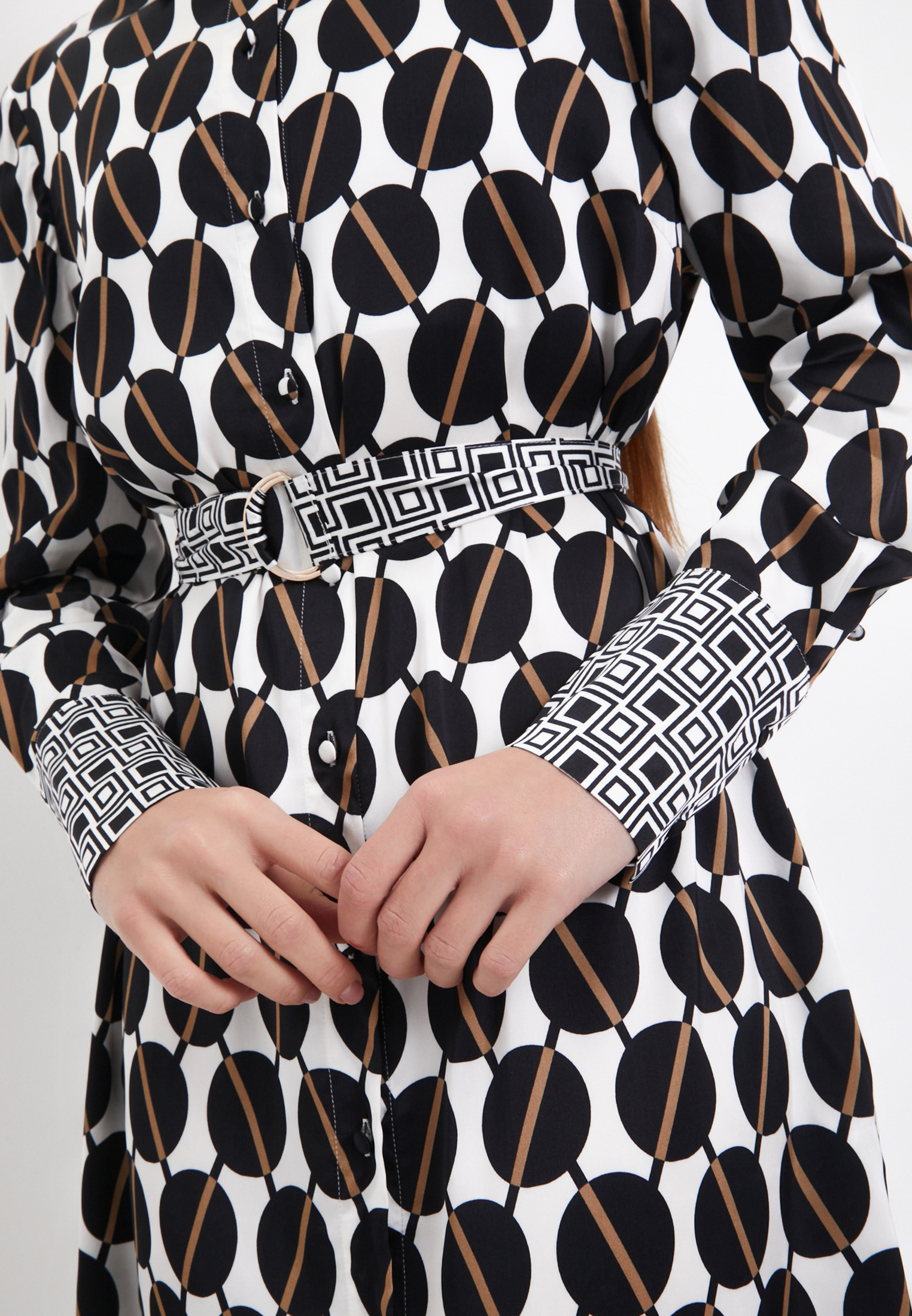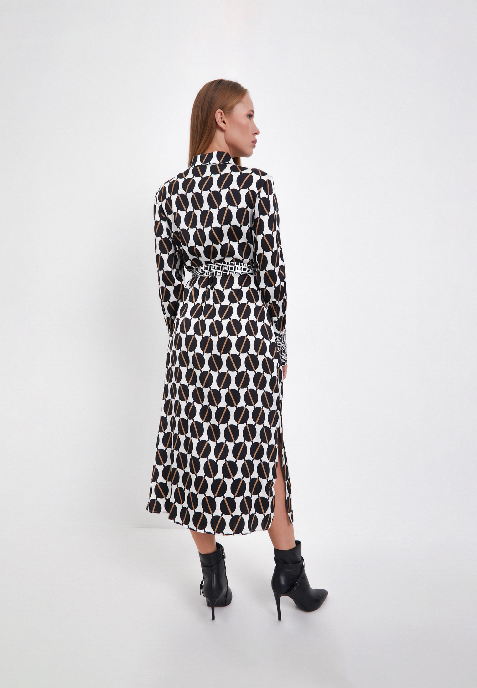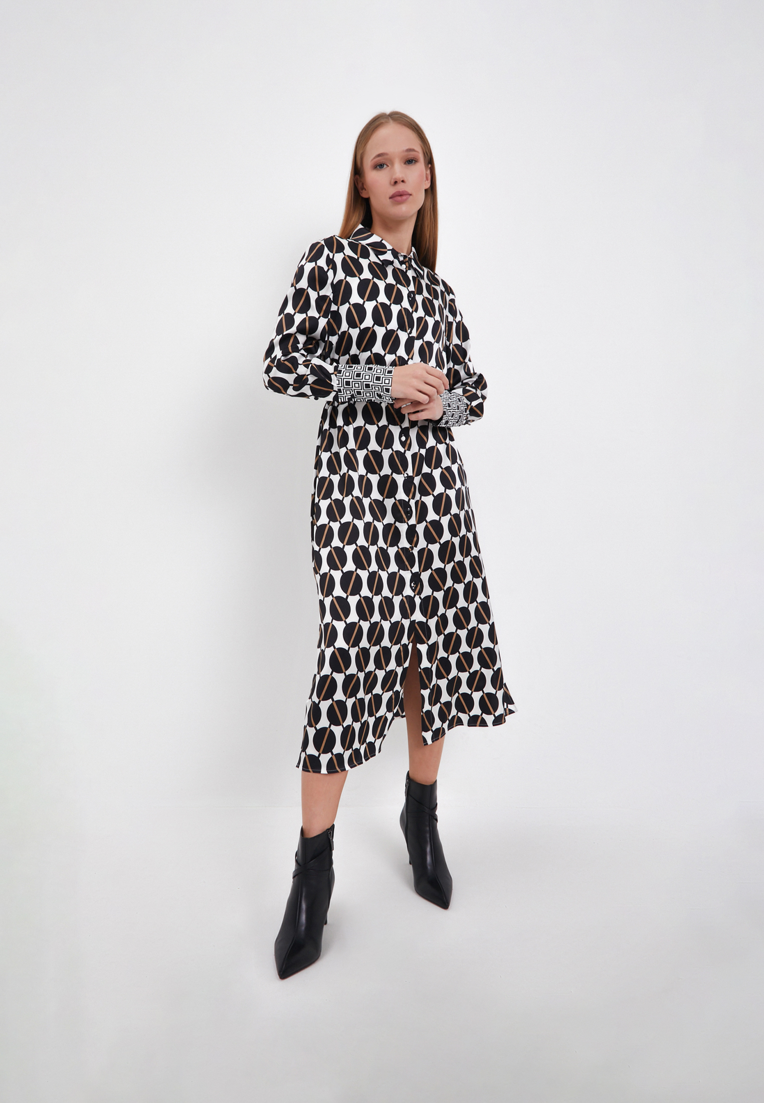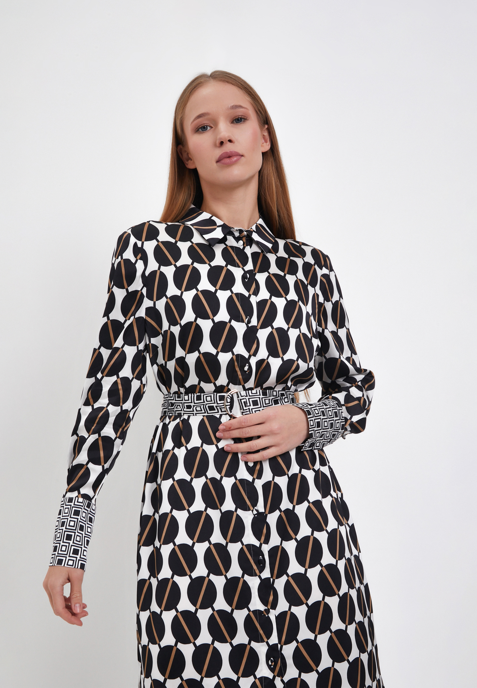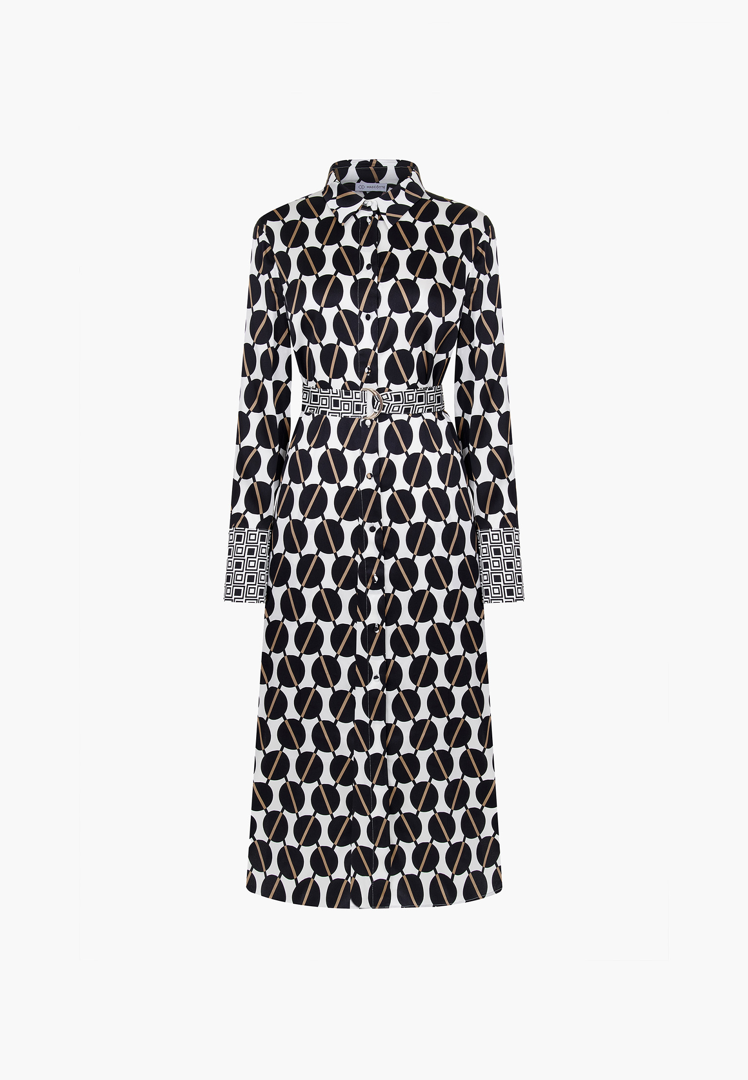 - Женское платье Mascotte из новой коллекции - элегантная и яркая деталь любого образа. В качестве материала была использована вискоза, что придает изделию хорошую воздухопроницаемость, легкость, гигроскопичность и легкость. Особый плюс в том, что модель не электризуется в носке. Геометричный принт придает особого акцента и притягивает взгляды. Застегивается платье на пуговицах и дополнительно фиксируется поясом. По бокам модели предусмотрен вырез в нижней части, который отвечает за свободу и комфорт в движении, а также два кармана. Свободный прямой силуэт подойдет любому типу фигуры, а аккуратная воротниковая зона придаст нотки шарма и женственности. На модели размер S. Параметры модели: 88-63-91, рост 175. Рекомендуема ручная стирка при температуре 30 градусов, глажка до 110 градусов, отбеливание и отжим запрещены. Сушить изделие эффективнее в горизонтальном положении.